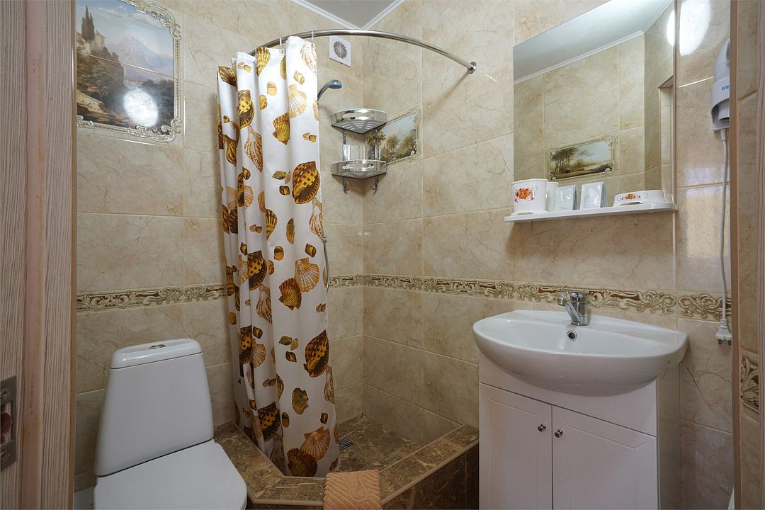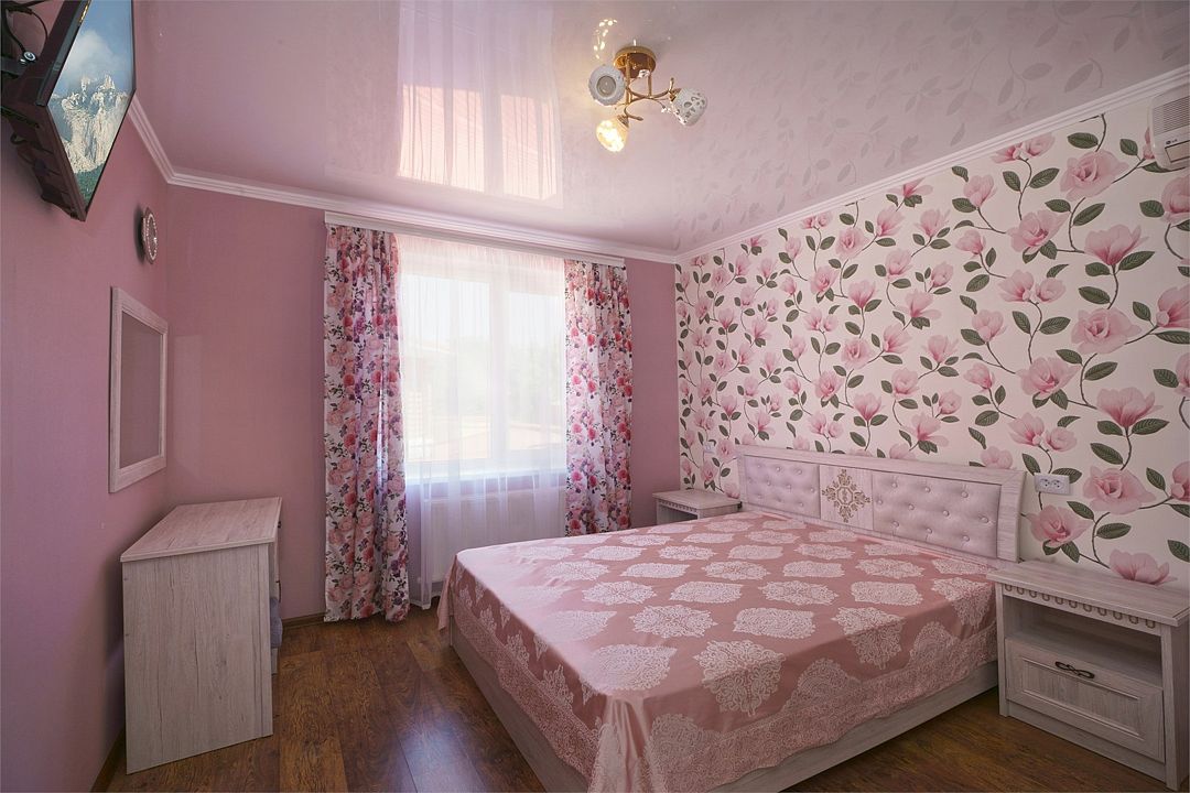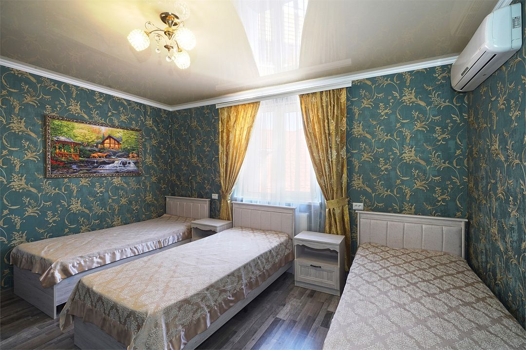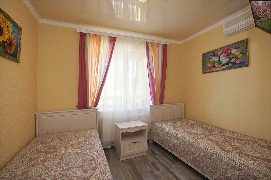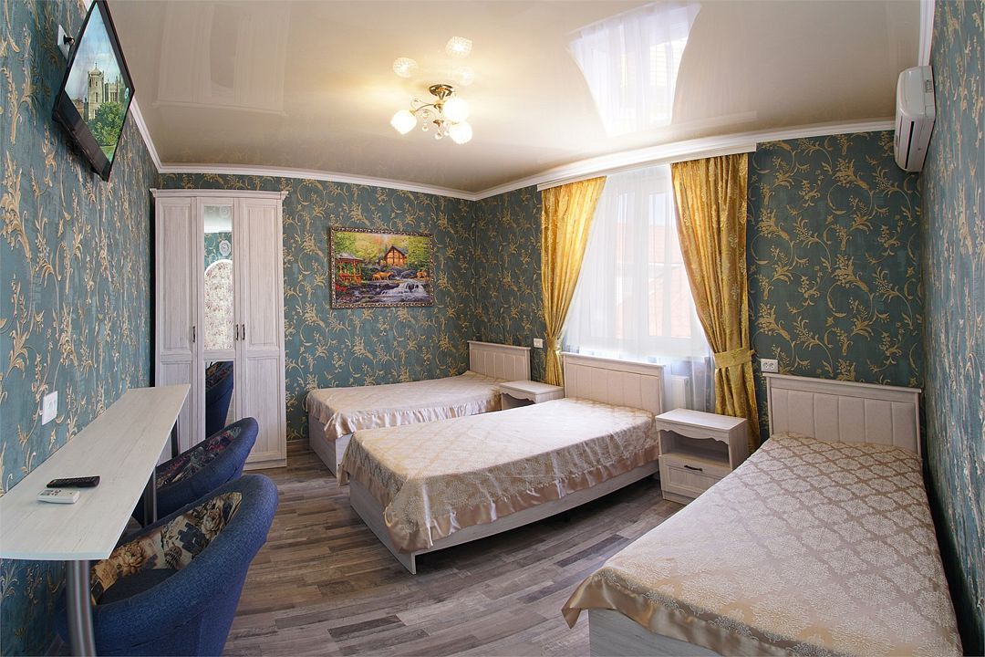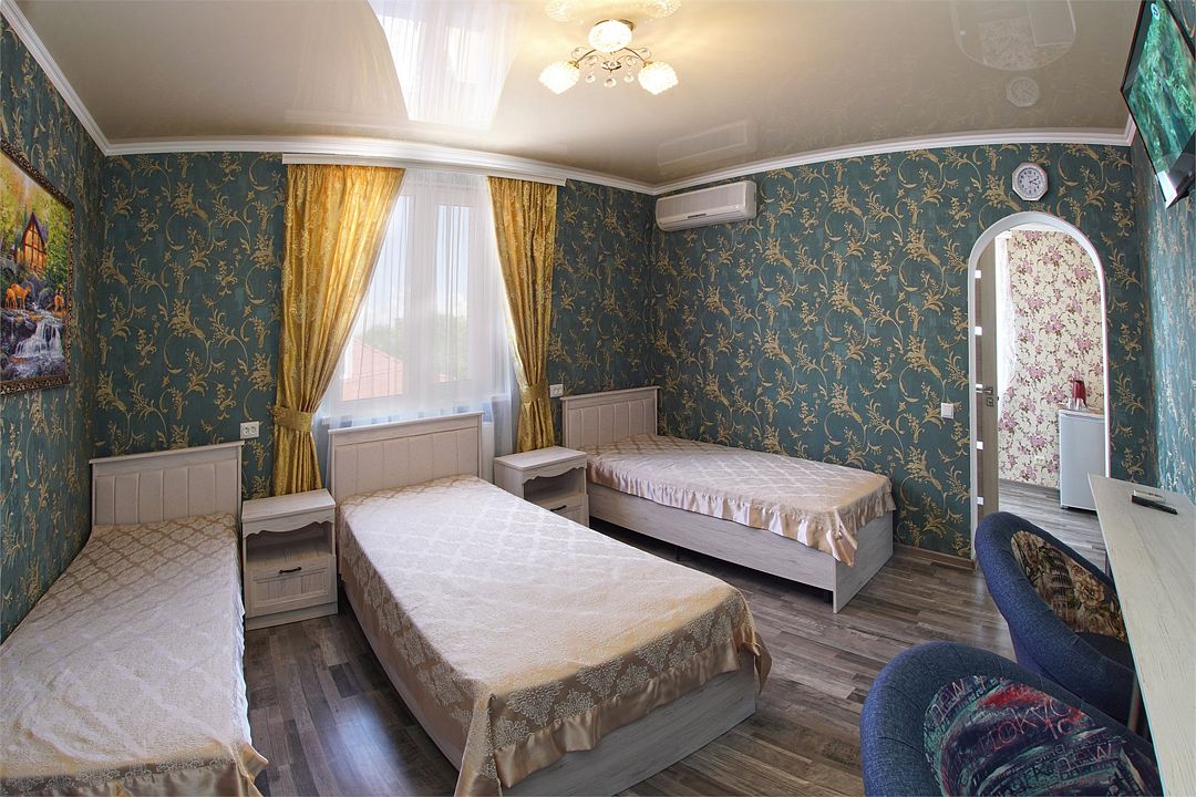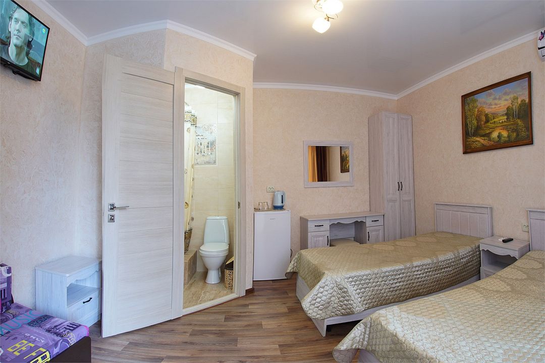 телевизор, Wi-Fi, кондиционер, фен, санузел, банные полотенца, двуспальная кровать, односпальная кровать, тумбы, шкаф для одежды, зеркало, сейф, раковина, душ, вид во двор, ламинат, стаканы, стол, туалетные средства, мини-холодильник, москитная сетка, пуфик, общественный бассейн, уборка номера, вешалки-плечики, мыло, вода из артезианской скважины, прачечная (за дополнительную плату), без питомцевВ гостиничном номере