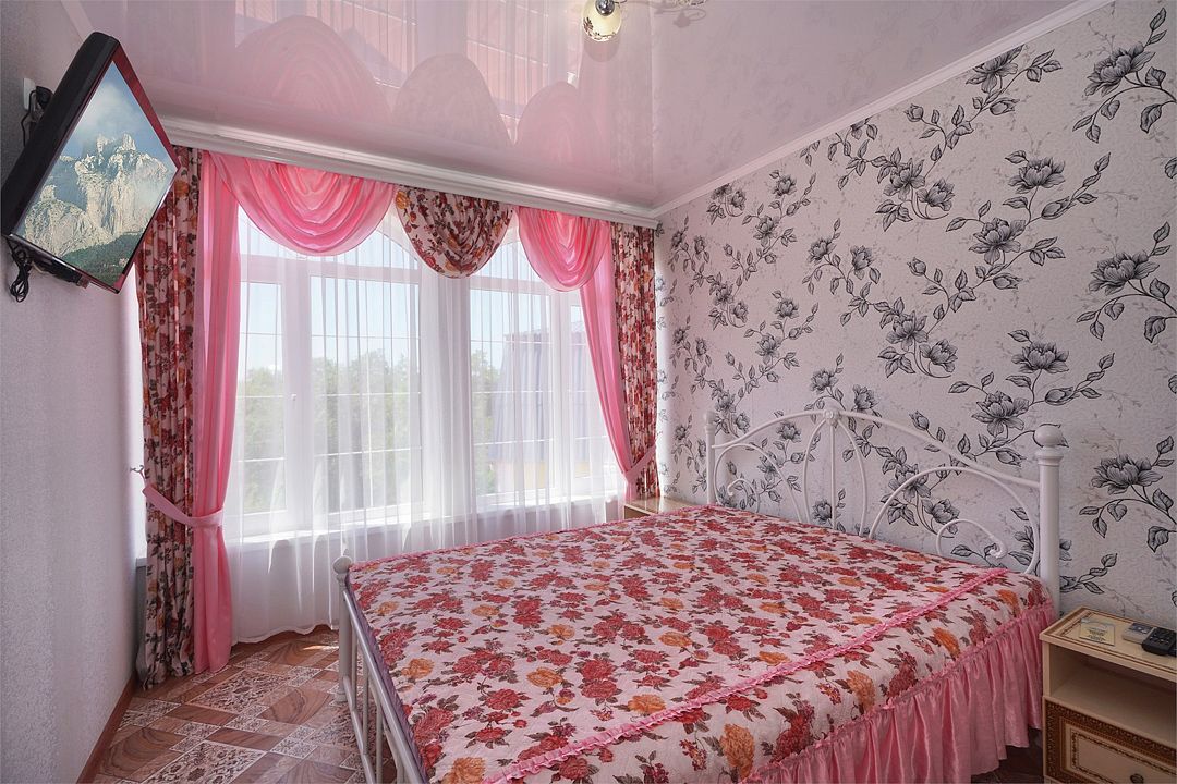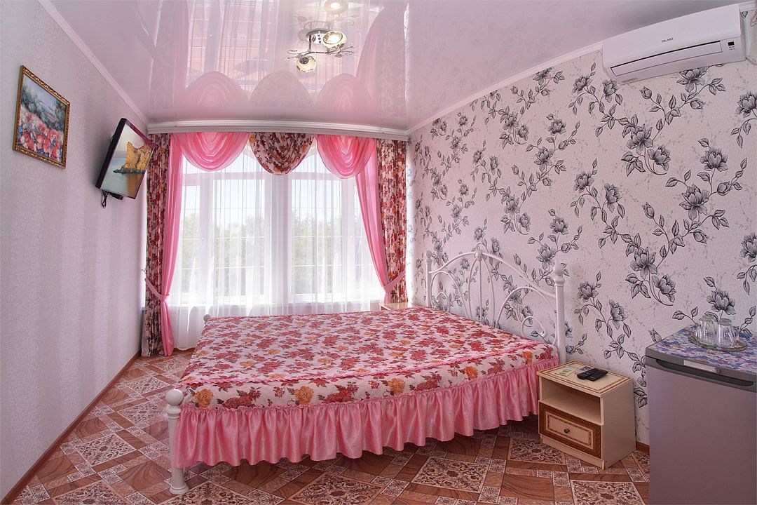 телевизор, Wi-Fi, кондиционер, фен, санузел, банные полотенца, двуспальная кровать, тумбы, шкаф для одежды, зеркало, сейф, раковина, душ, вид во двор, стаканы, стол, туалетные средства, мини-холодильник, пуфик, общественный бассейн, уборка номера, вешалки-плечики, мыло, вода из артезианской скважины, прачечная (за дополнительную плату), без питомцевВ гостиничном номере