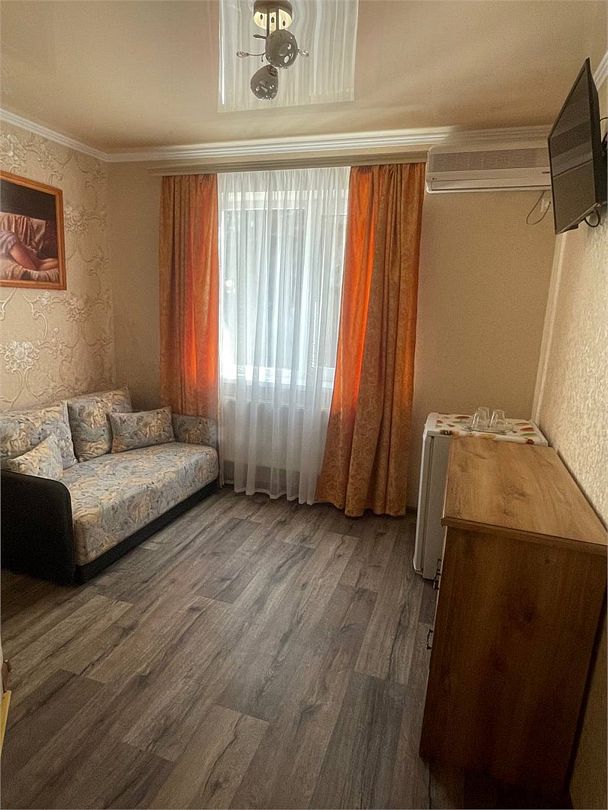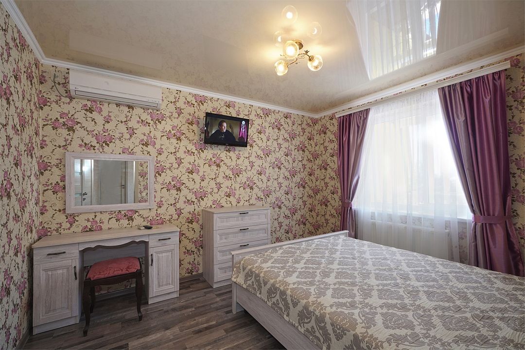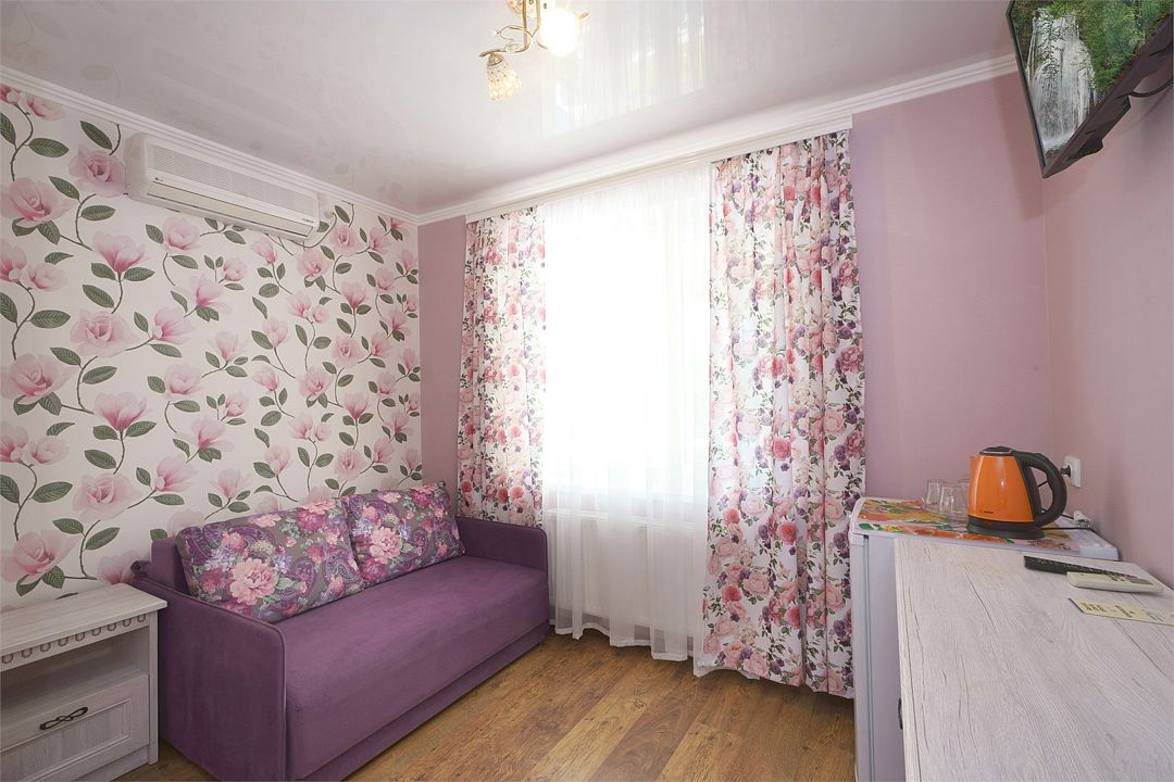 телевизор, Wi-Fi, холодильник, кондиционер, фен, санузел, двуспальная кровать, тумбы, шкаф для одежды, зеркало, комод, сейф, чайник, раковина, душ, вид во двор, стаканы, стол, туалетные средства, диван-кровать, раскладной диван, москитная сетка, общественный бассейн, уборка номера, вешалки-плечики, мыло, вода из артезианской скважины, прачечная (за дополнительную плату), без питомцевВ гостиничном номере