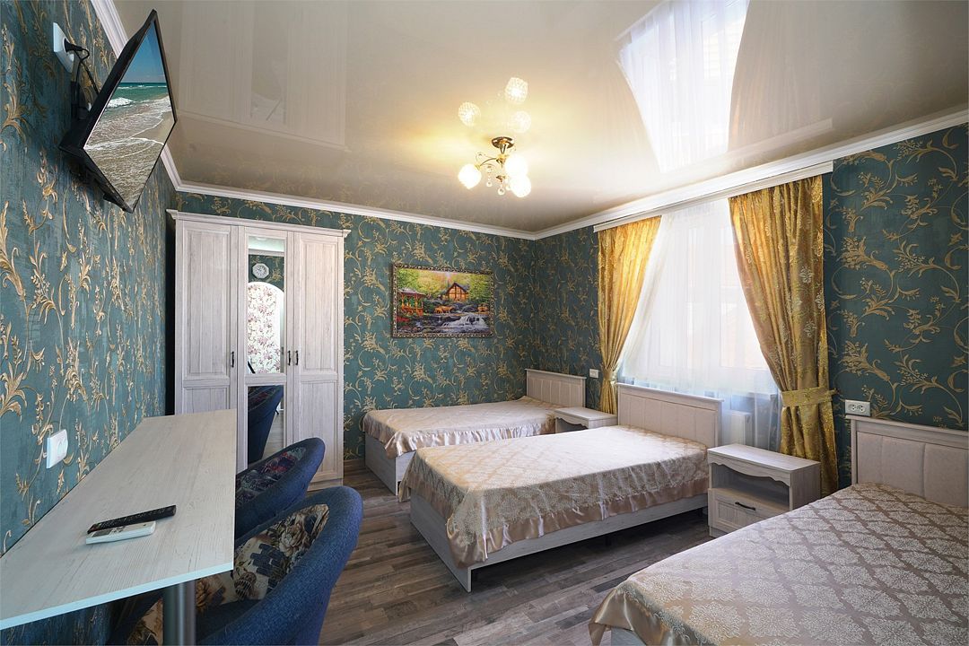 телевизор, Wi-Fi, холодильник, кондиционер, фен, санузел, банные полотенца, балкон, тумбы, журнальный столик, зеркало, сейф, чайник, раковина, душ, три односпальные кровати, вид во двор, стаканы, туалетный столик, туалетный столик, туалетные средства, сушилка для белья, диван-кровать, раскладной диван, шкаф-купе, пуфик, общественный бассейн, уборка номера, услуги прачечной (платно), вешалки-плечики, мыло, вода из артезианской скважины, прачечная (за дополнительную плату), без питомцевВ гостиничном номере