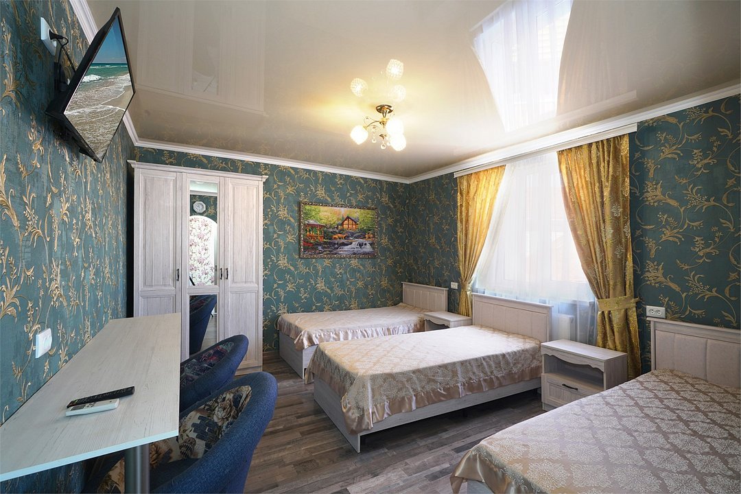 телевизор, Wi-Fi, холодильник, кондиционер, фен, санузел, банные полотенца, балкон, тумбы, журнальный столик, зеркало, сейф, чайник, раковина, душ, три односпальные кровати, вид во двор, стаканы, туалетный столик, туалетный столик, туалетные средства, сушилка для белья, диван-кровать, раскладной диван, шкаф-купе, пуфик, общественный бассейн, уборка номера, услуги прачечной (платно), вешалки-плечики, мыло, вода из артезианской скважины, прачечная (за дополнительную плату), без питомцевВ номере
