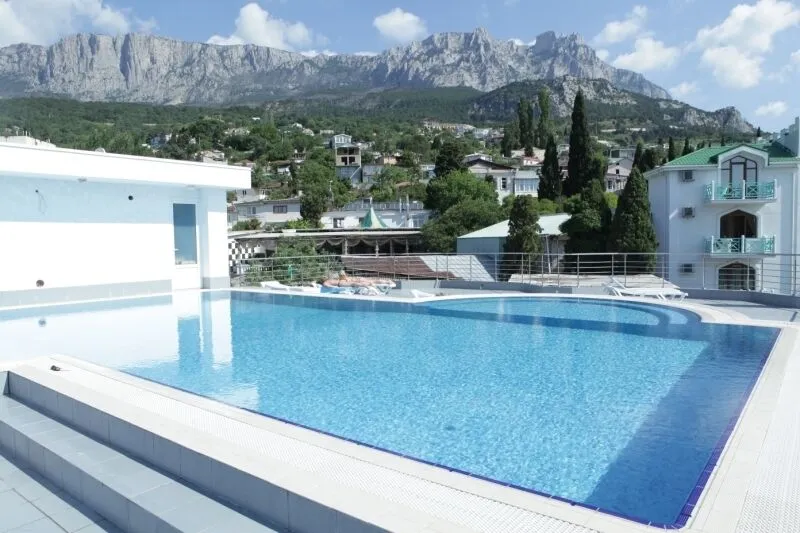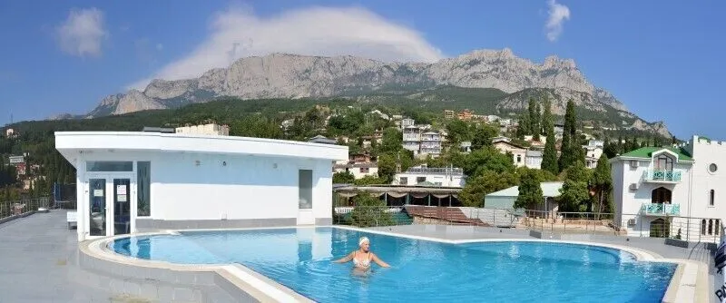 На крыше есть собственный бассейн с лежаками, откуда открываются виды на море и гору Айпетри.