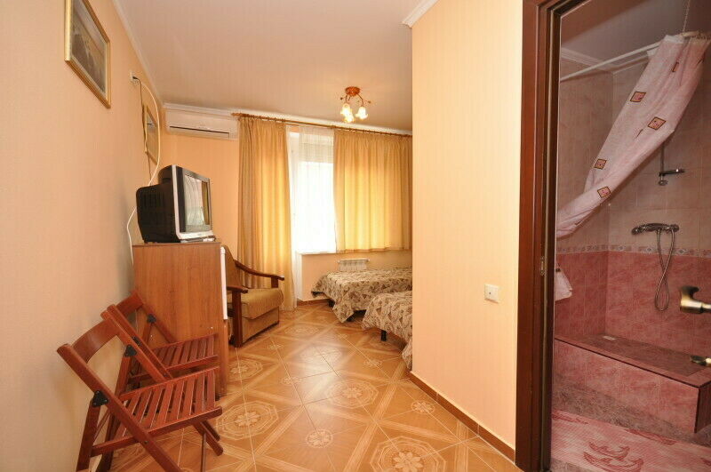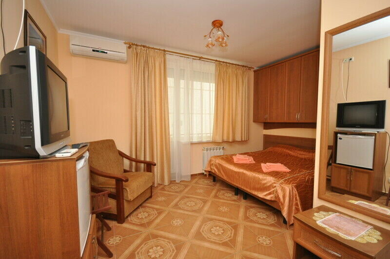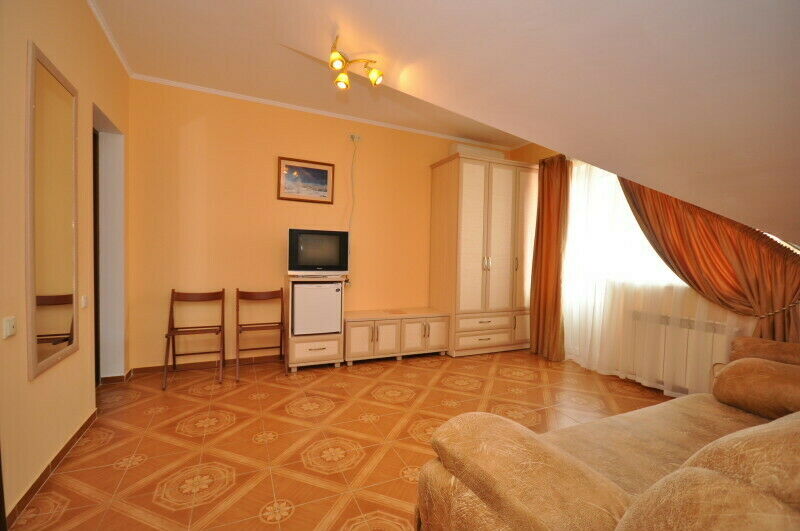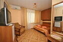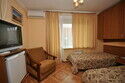 Двухкомнатный номер для компании друзей или большой семьи. Кондиционер, спутниковое телевидение, холодильник, набор посуды, санузел. По требованию предоставляются фен и электрочайник. Все номера - с балконами. Подача горячей и холодной воды на территории осуществляется круглосуточно. Частота уборки в номере - 1 раз в 3 дня. Смена постельного белья - 1 раз в 5 дней.