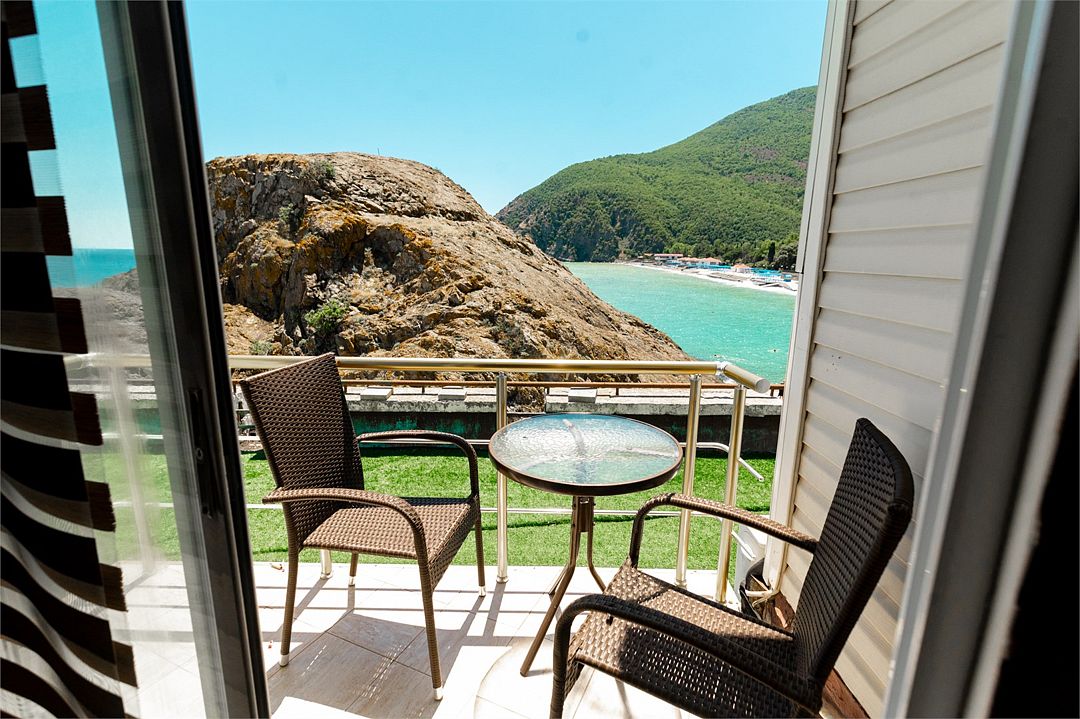 Просторный люкс с панорамными окнами в пол, с завораживающим видом на море и гору "Аю-Даг". Номер оснащен кухней, современной мебелью, с совмещенной двуспальной кроватью или 2-я раздельными, на выбор. В номере могут комфортно разместиться 2 человека, так же возможно одно дополнительное место. Номер расположен на 2-м этаже.Услуги и удобства