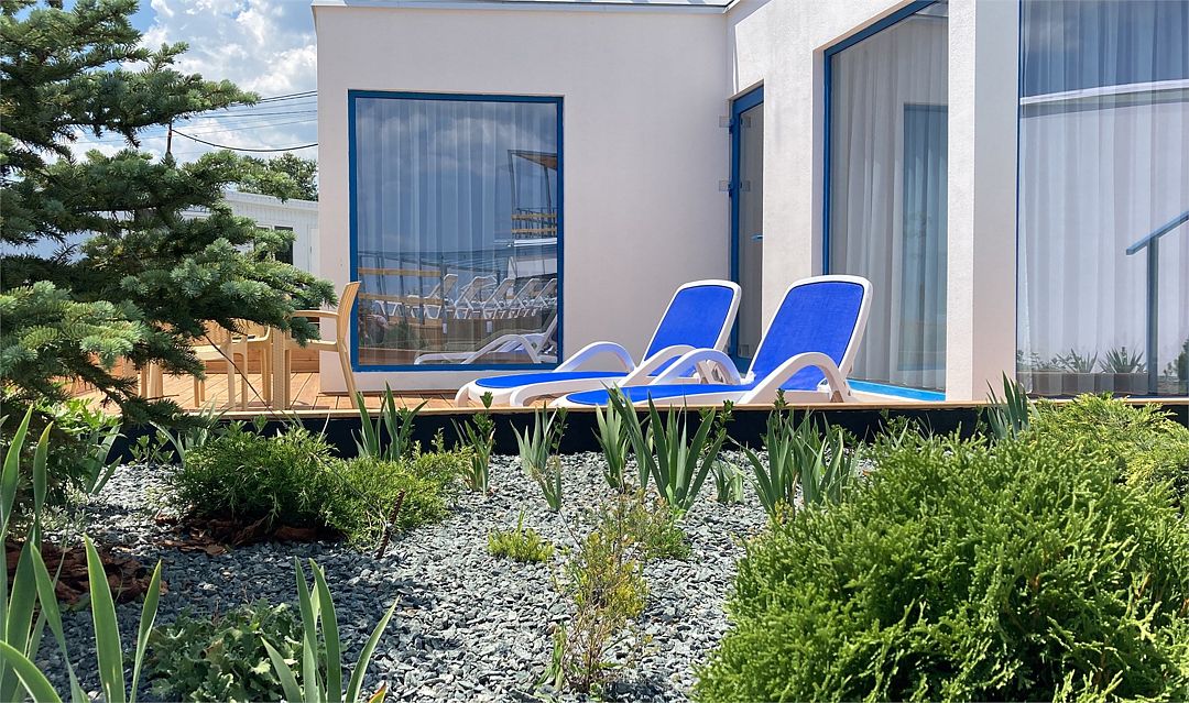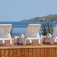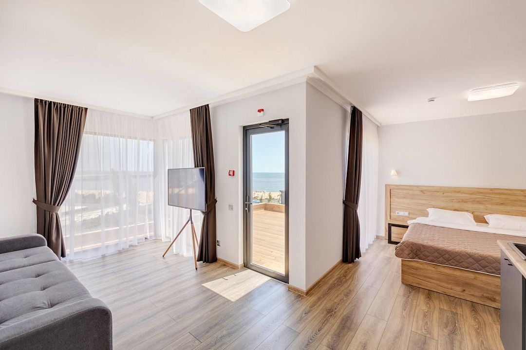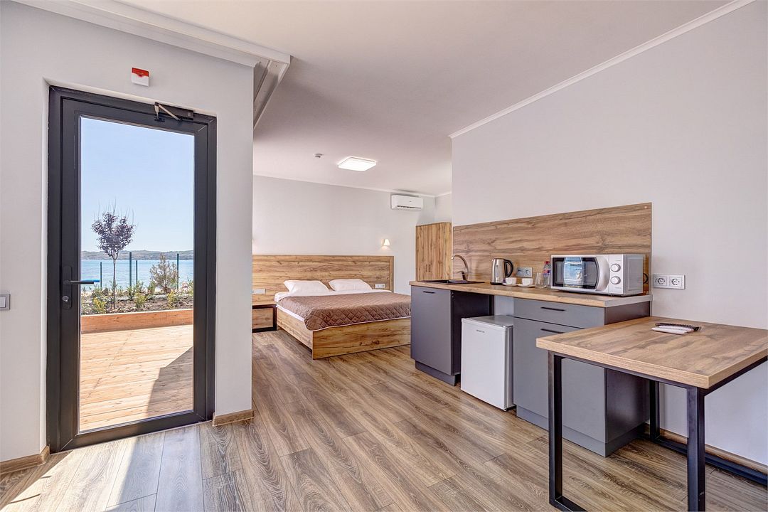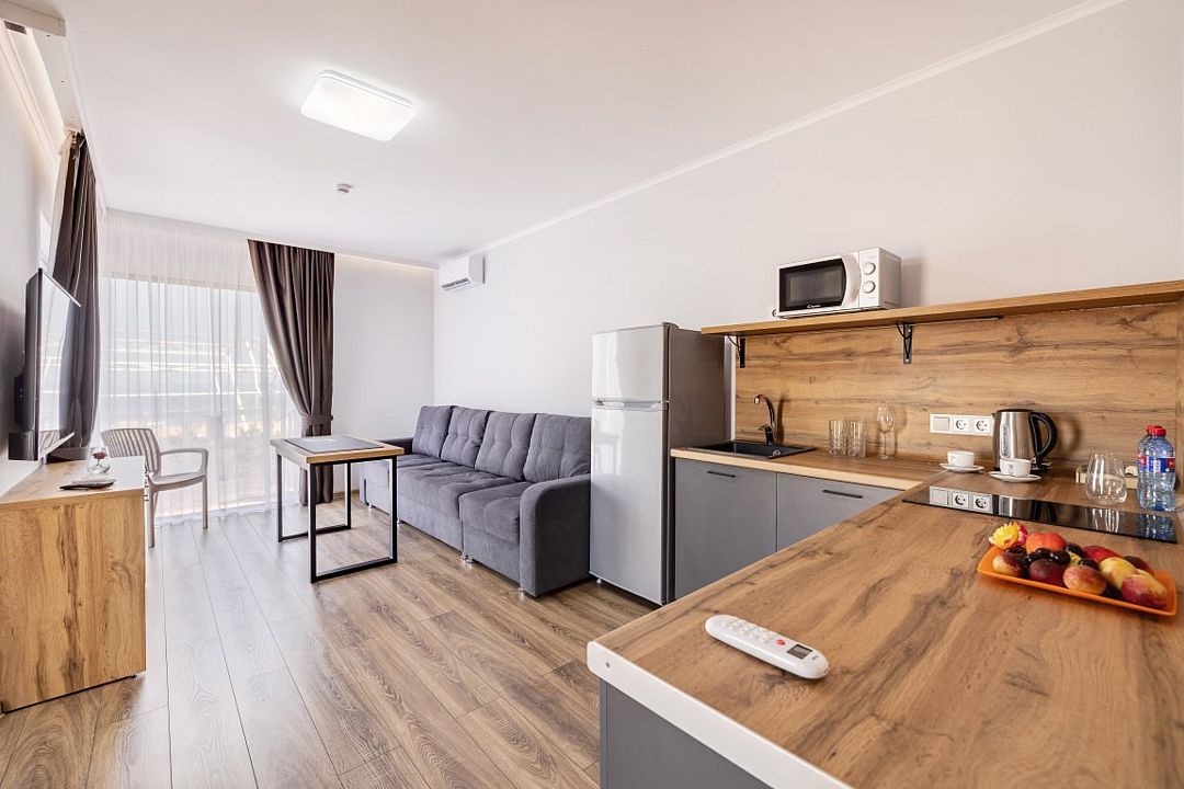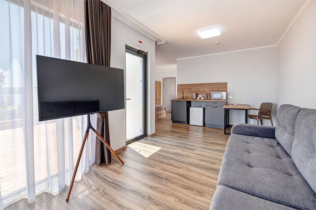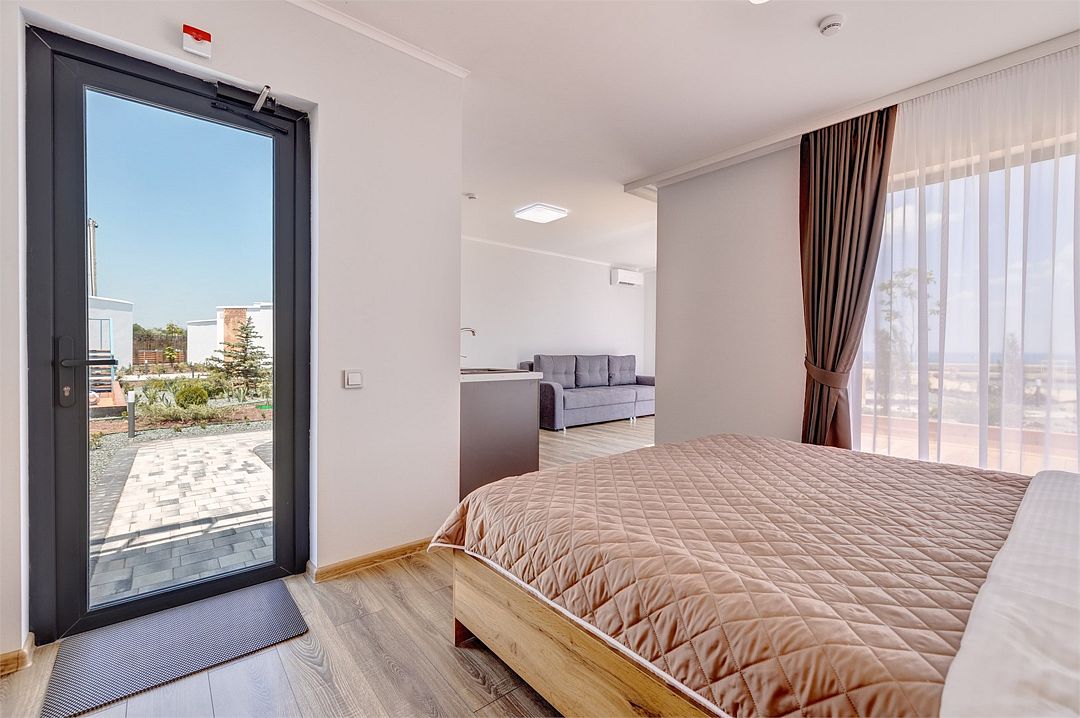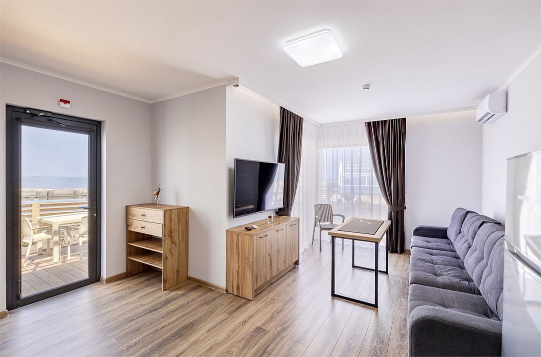 Современная студия с собственной террасой и панорамным видом на море и сад. В номере есть все для комфортного отдыха: собственная зона солярия с шезлонгами, цифровое телевидение, большой диван.Услуги и удобства