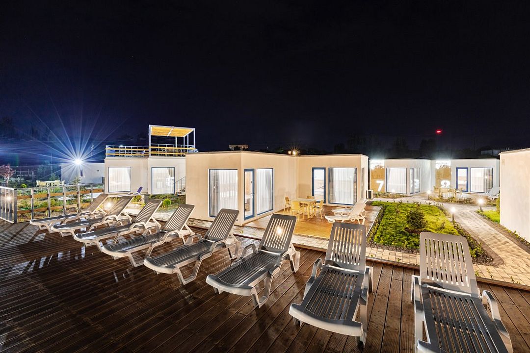 Небольшой двухместный номер с панорамными окнами и обеденной зоной на террасе.Услуги и удобства