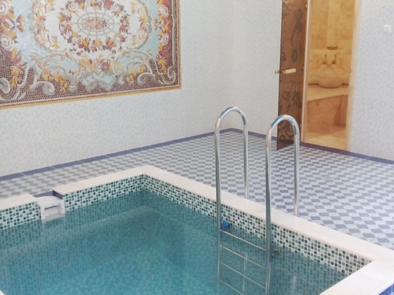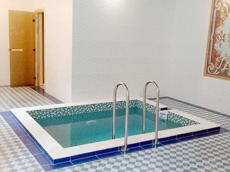 Для удобства и безопасности постояльцев бассейн оборудован плавным входом и удобными ступенями. По всему периметру установлены надежные поручни, что позволяет гостям чувствовать себя максимально защищенными во время водных процедур. Рядом с бассейном расположена зона отдыха с шезлонгами и столиками.