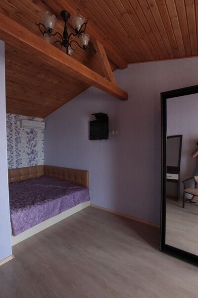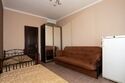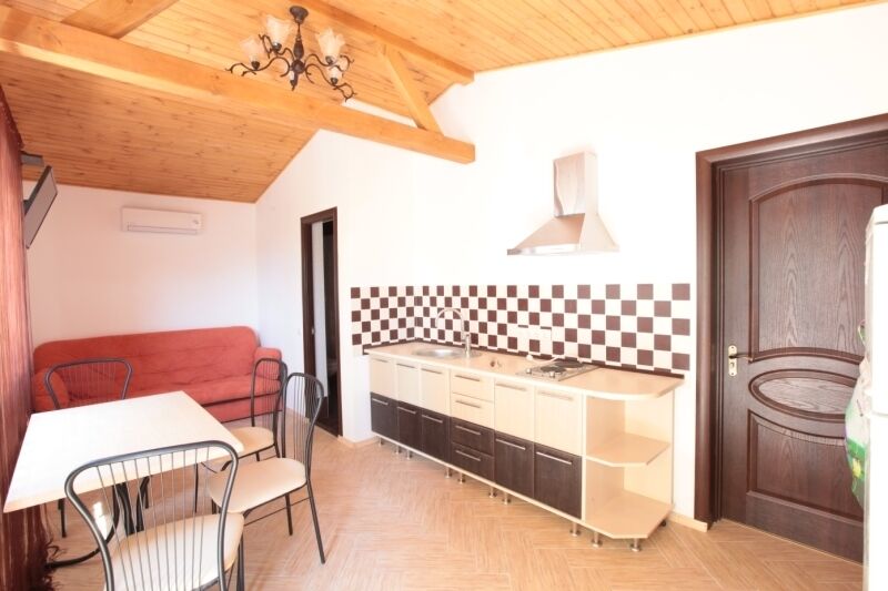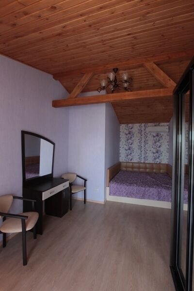 Комната выполнена согласно всем современных веяниям дизайна и требованиям к меблировке. В спальной комнате установлена двуспальная кровать, шкаф и туалетный столик с зеркалом. вторая комната оборудована кухней, здесь есть диван и стол со стульями. Есть санузел, холодильник, телевизор и кондиционер, что сделает отдых гостей здесь максимально комфортным.