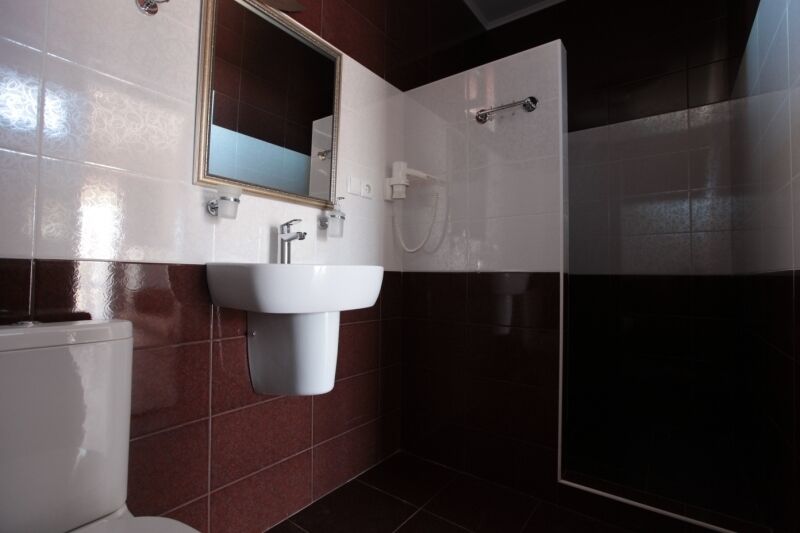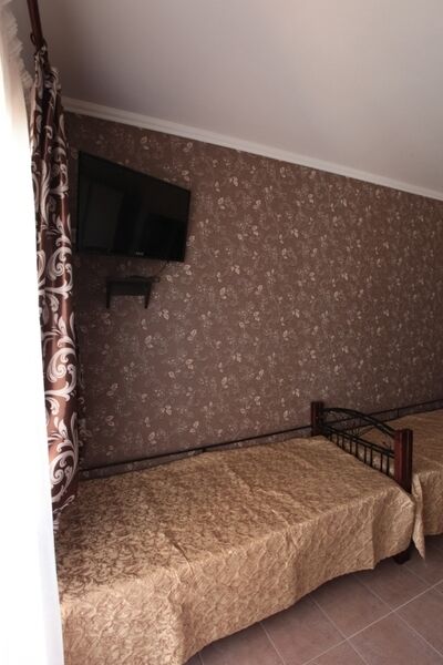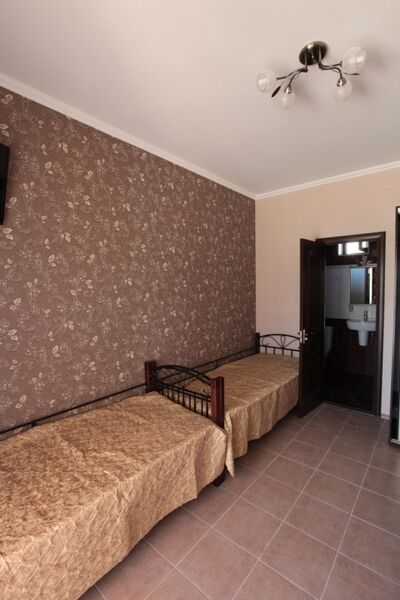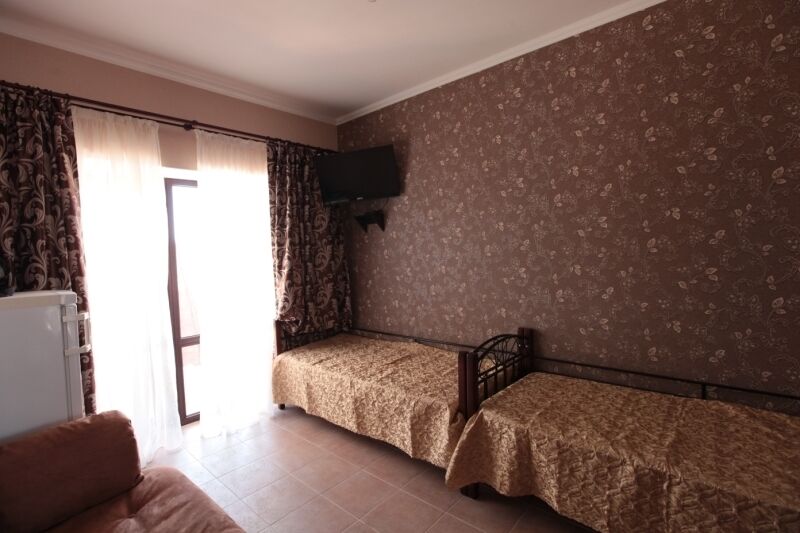 Комната выполнена в приятных молочно-золотых тонах, с новой мебелью и санузлом. Здесь есть балкон, кондиционер и телевизор. В качестве спальных мест установлены 2 односпальные кровати и диван.