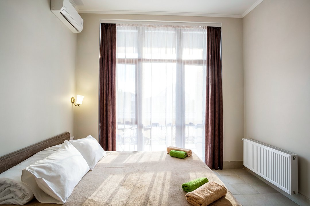 В распоряжении гостей светлые просторные номера, в том числе двухкомнатные апартаменты с террасой. Каждый номер оснащен индивидуальным санузлом с душем, феном и туалетными принадлежностями, в комнатах есть кондиционер, электрочайник, мини-холодильник.