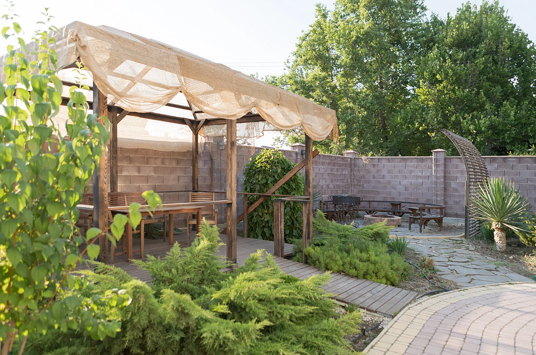 Для гостей на территории организована лаундж-зона с деревянными качелями, беседками и уличной кальянной. К услугам отдыхающих также баня, охраняемая парковка и беспроводной интернет, доступный на всей территории. А для детей организована игровая площадка с батутом.