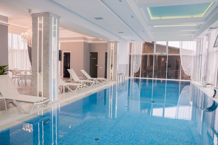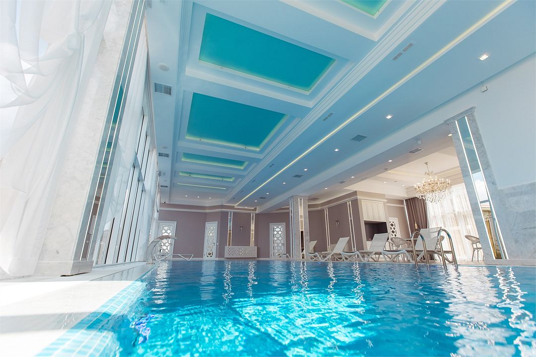 В СПА-отеле в Симферополе бассейн с подогревом, так что можете не бояться переохладиться и заболеть — мы позаботились об этом. Тут также есть шезлонги для вашего удобства.