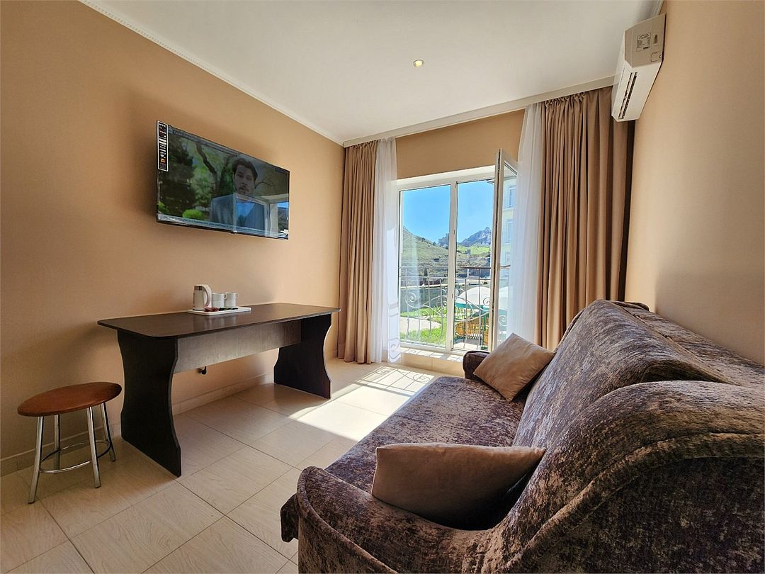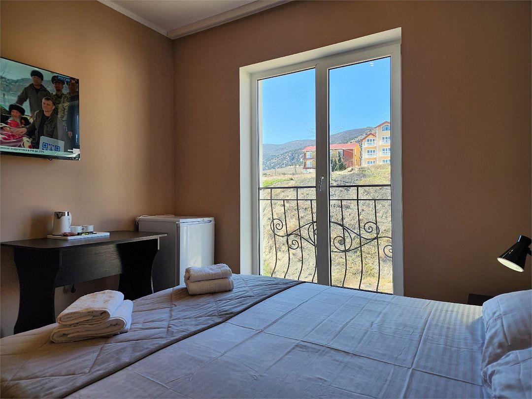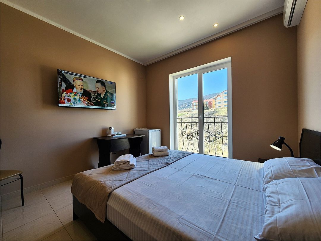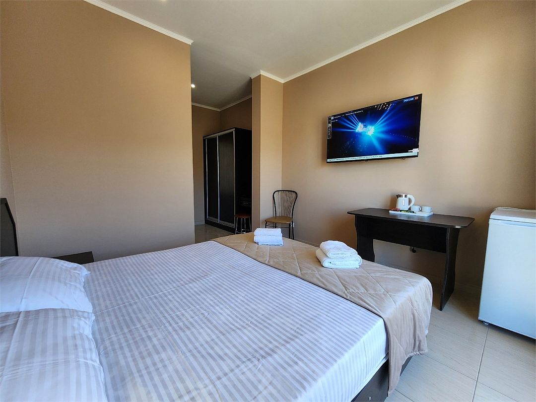 телевизор, Wi-Fi, холодильник, кондиционер, фен, санузел, банные полотенца, гигиенические средства, две односпальные или большая двуспальная кровать, тумбы, стулья, шкаф для одежды, зеркало, чайный набор, чайник, душ, вид на город, стол, туалет, сушилка для белья, вид на горыВ гостиничном номере