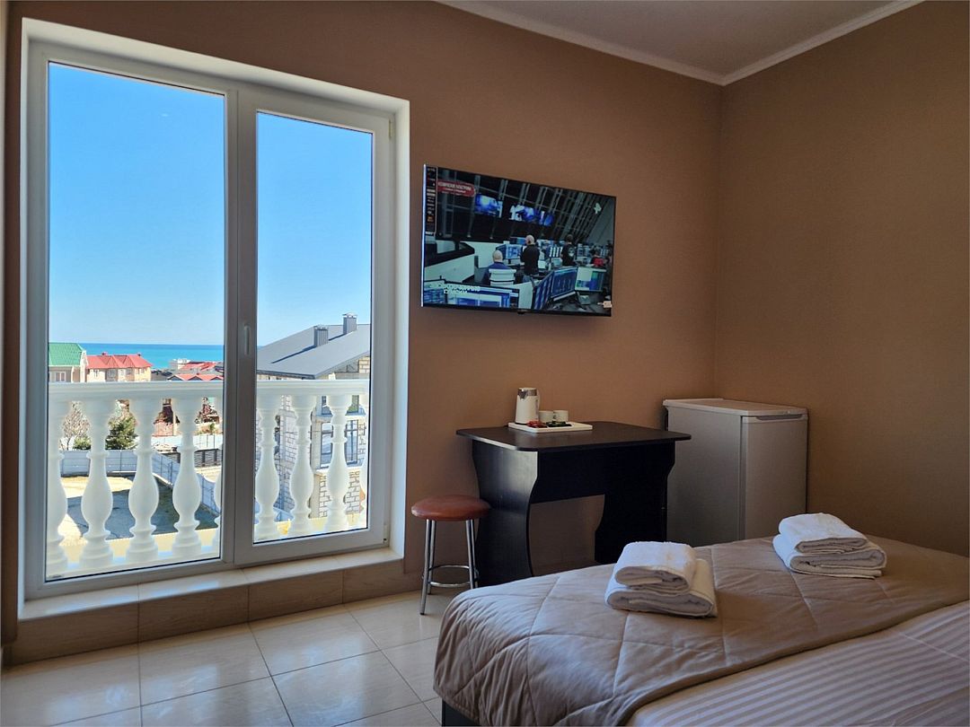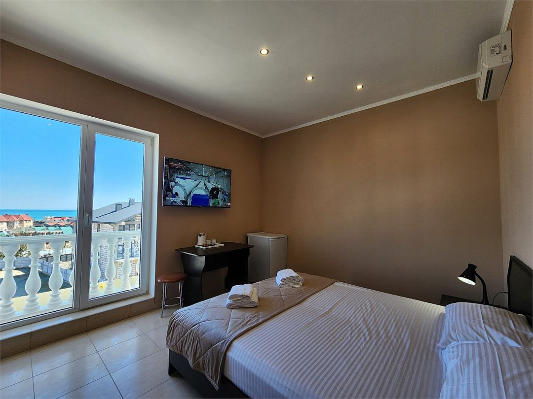 телевизор, Wi-Fi, холодильник, кондиционер, фен, санузел, банные полотенца, гигиенические средства, две односпальные или большая двуспальная кровать, тумбы, стулья, шкаф для одежды, зеркало, чайный набор, чайник, душ, вид на город, стол, туалет, панорамные окна, сушилка для белья, вид на горы, частичный вид на мореВ гостиничном номере