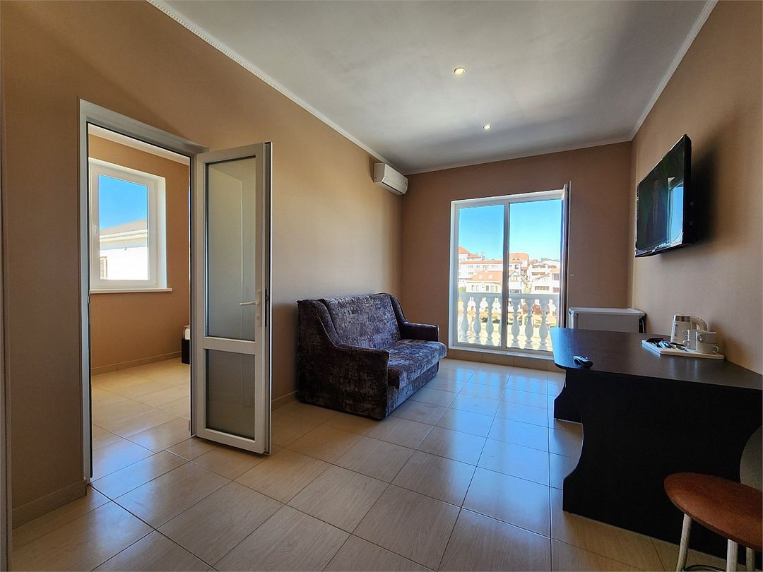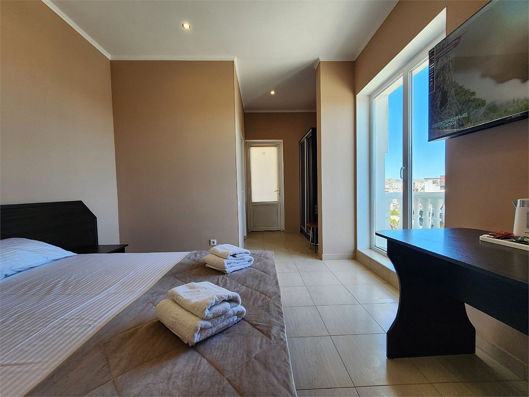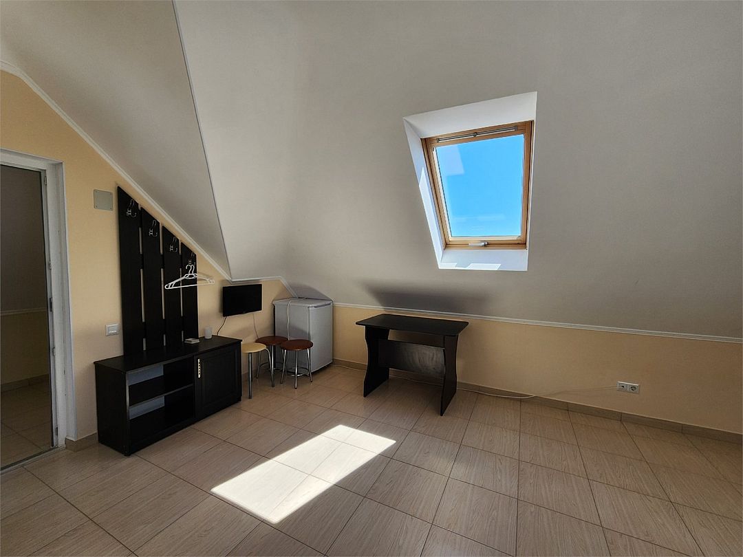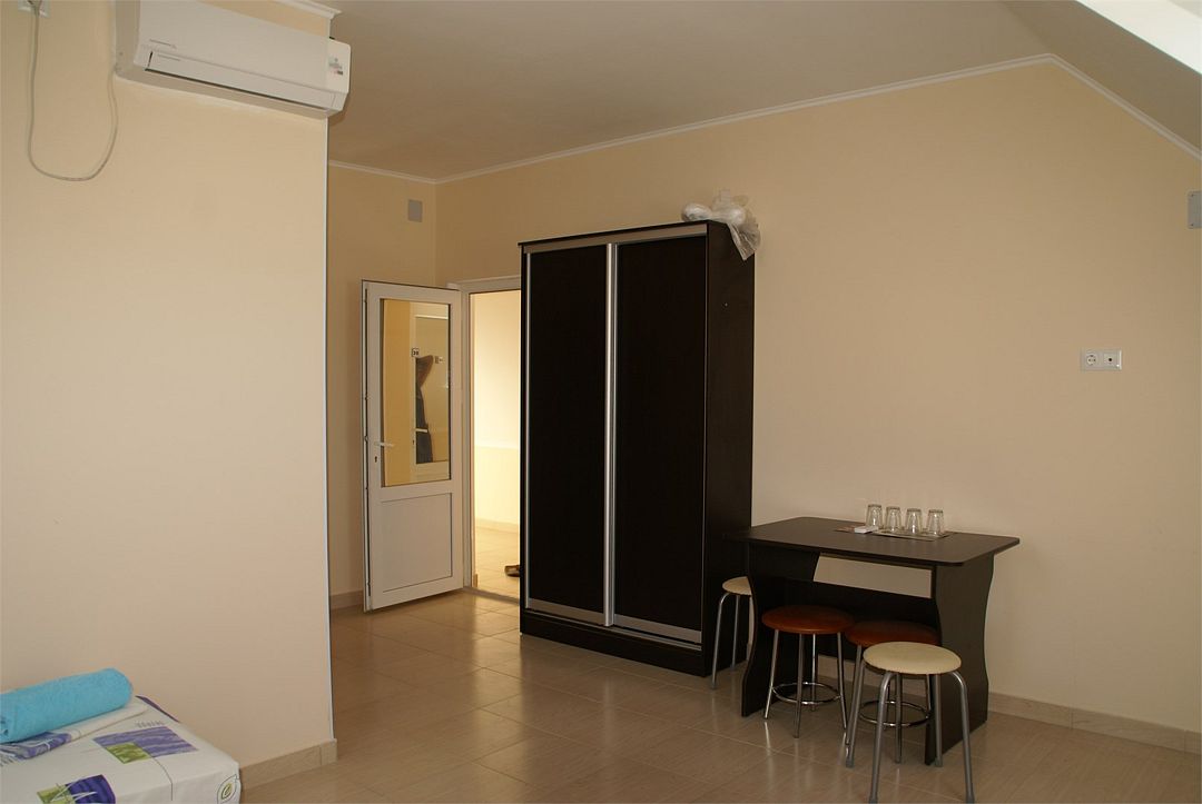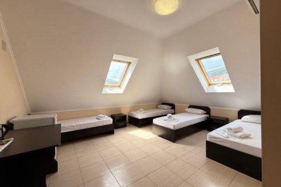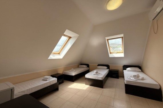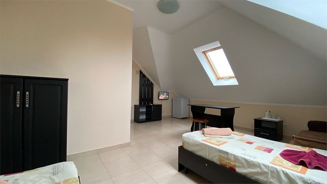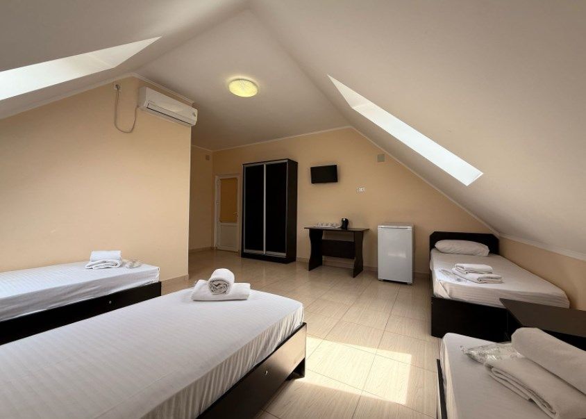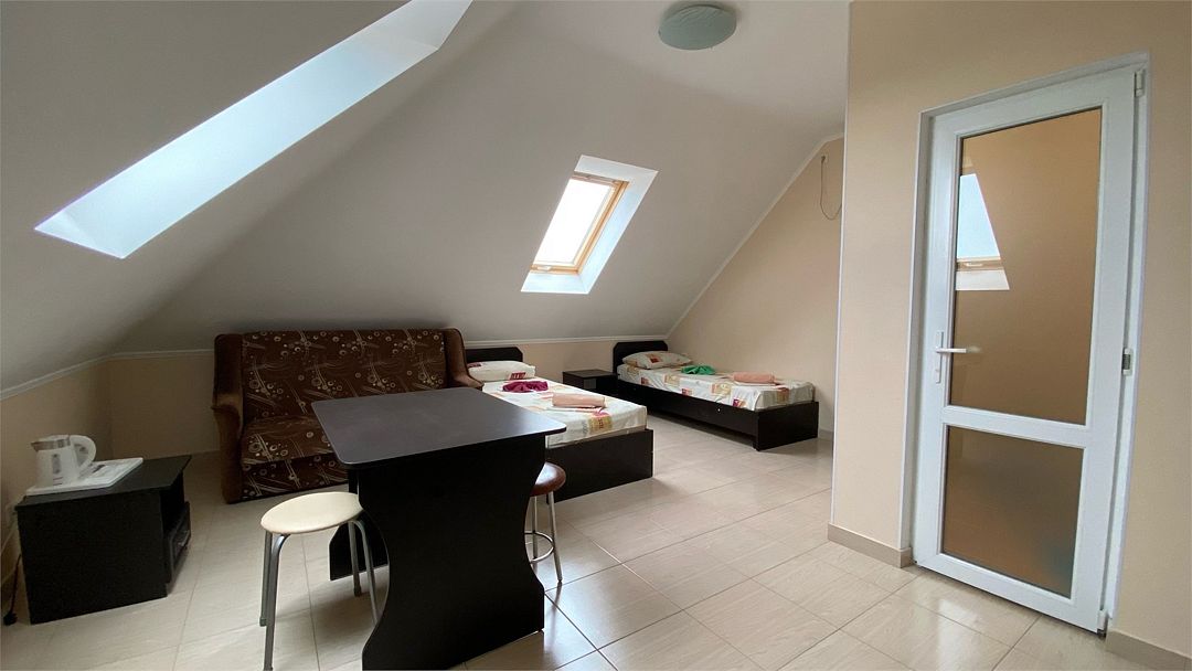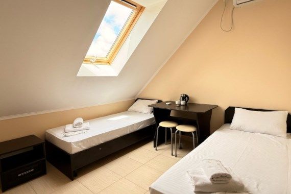 Номера на 4м этаже, мансардные - отличный вариант для тех, кто ищет вариант для отдыха с удобствами и не дорого. В номерах данной категории 3 односпальных кровати бокс-спринг - при необходимости, их можно сдвинуть в двуспальную кровать. Доп.место - евро.раскладушка. Есть просторный общий балкон.Услуги и удобства