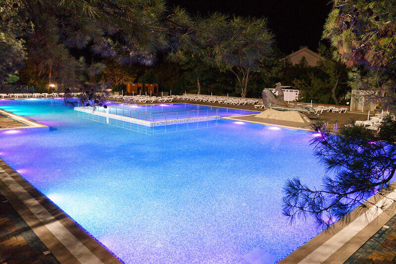 Читать полностьюБольшой бассейн разделен на три зоны: взрослую, зону для аквааэробики и детскую. Оборудован современной круглосуточной системой очистки и фильтрации морской воды.
