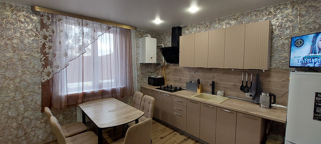 Особое внимание уделено деталям: в доме всегда чисто, постельное белье свежее, а в ванной комнате — полный набор гигиенических средств. Кухня оборудована всем необходимым — от варочной панели до микроволновки и набора специй. Даже если вы приедете поздно, в холодильнике вас уже будут ждать пельмени и напитки, чтобы не оставаться голодными. Из окон открывается тихий вид во двор, что гарантирует спокойствие и уединение вдали от городского шума.