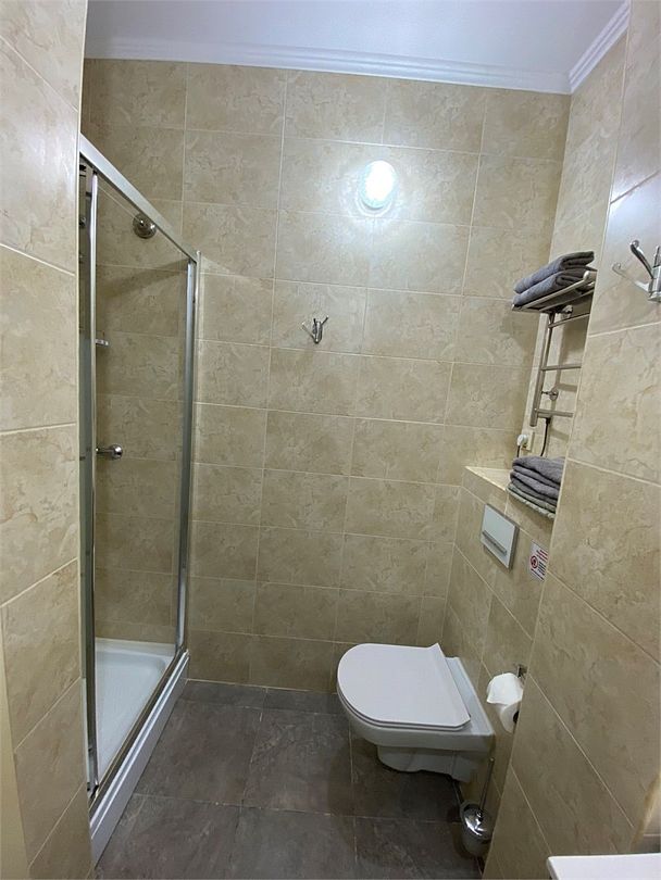 Современный классический продуманный дизайн и удобная мебель, туалетная комната с душевой кабиной.