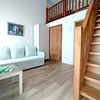 Двухуровневый номер с видом на море, без балкона. На первом уровне — гостиная с диваном, на втором — кровать.