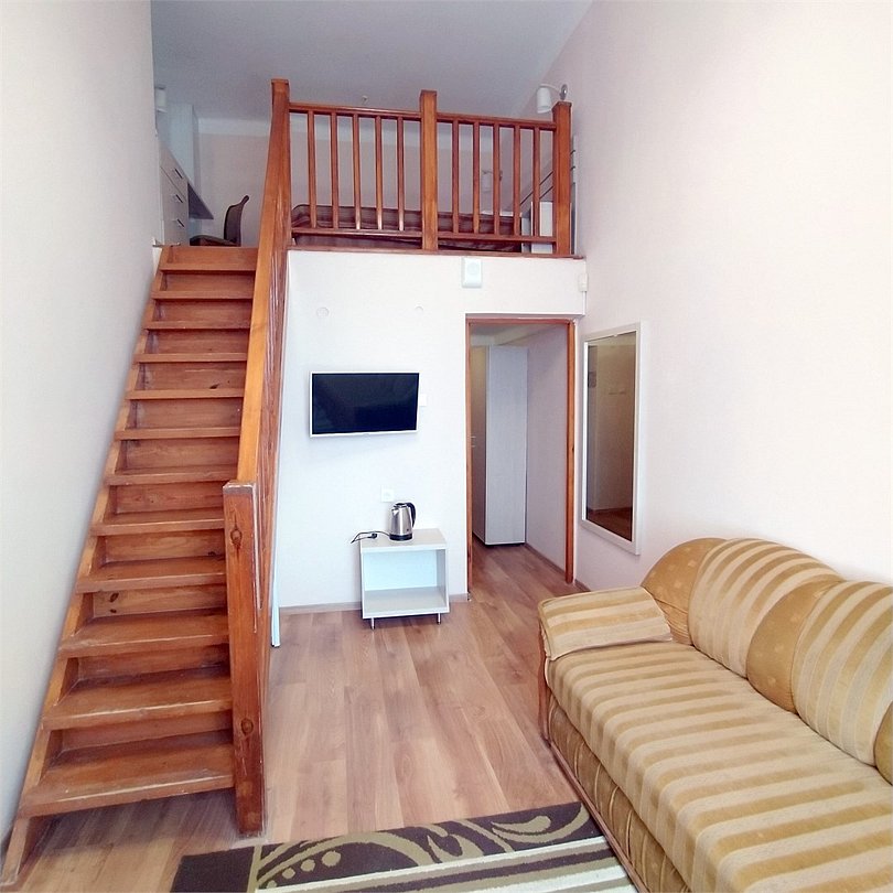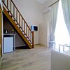 Двухуровневый двухкомнатный номер с видом на море, с балконом. На первом этаже — маленькая комната-спальня с кроватью и холл с диваном и ТВ. На втором этаже — спальня.