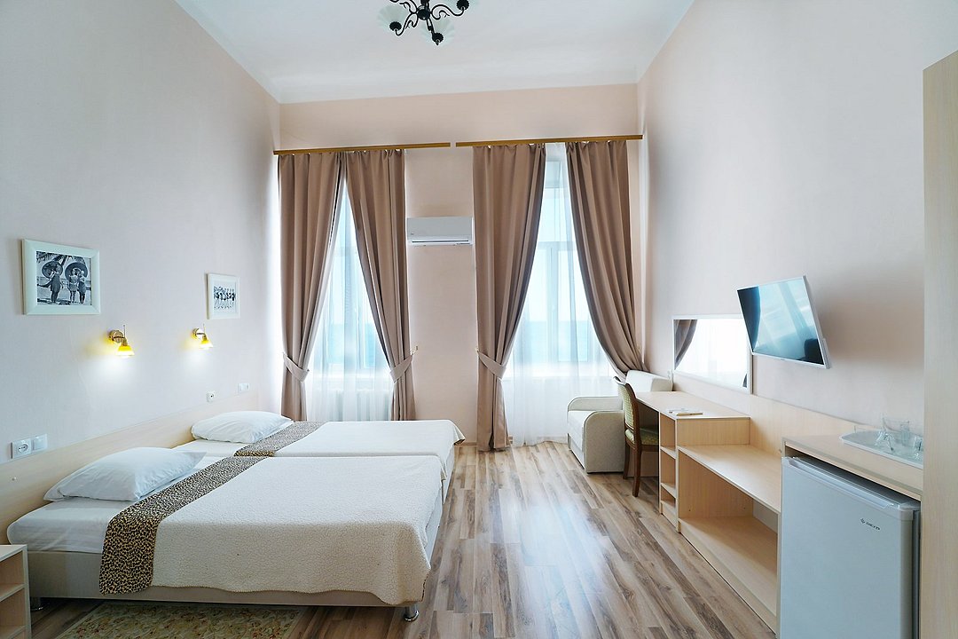 Просторный двухместный номер с видом на море, без балкона. Светлая комната с большими окнами и высокими потолками создает атмосферу уюта и комфорта.