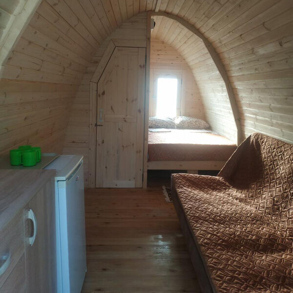 Спальное место 1,4 м. и раскладной диван. У Домика своя мангальная зона.