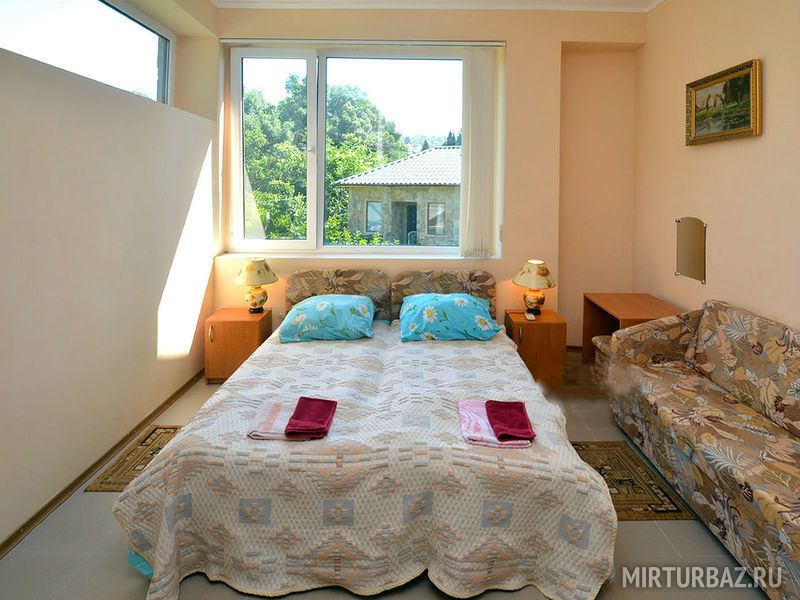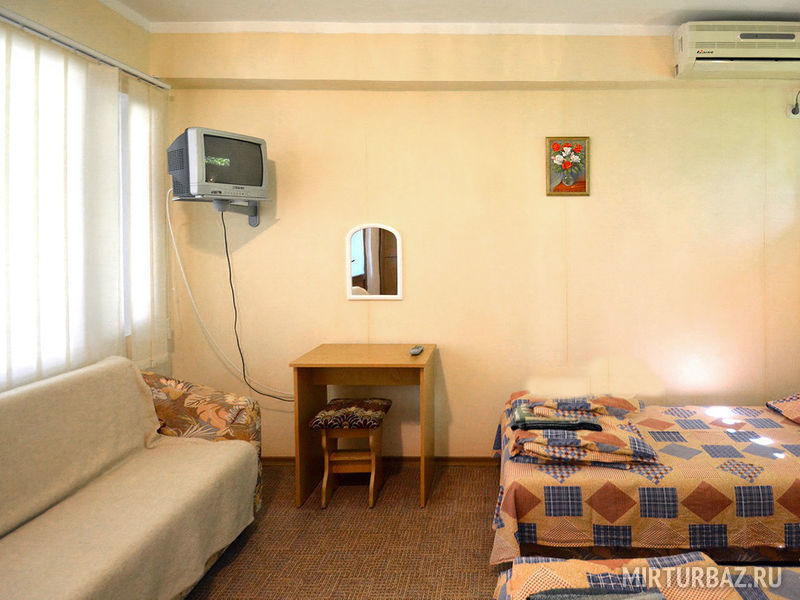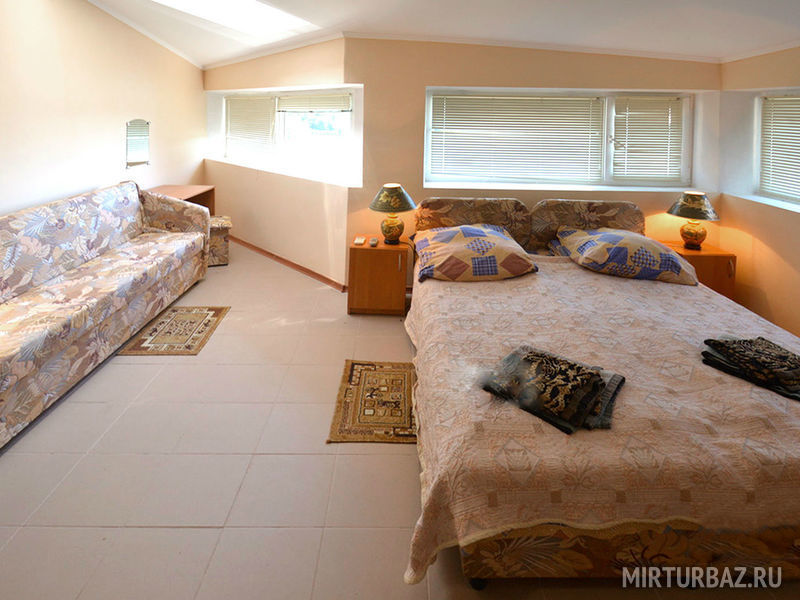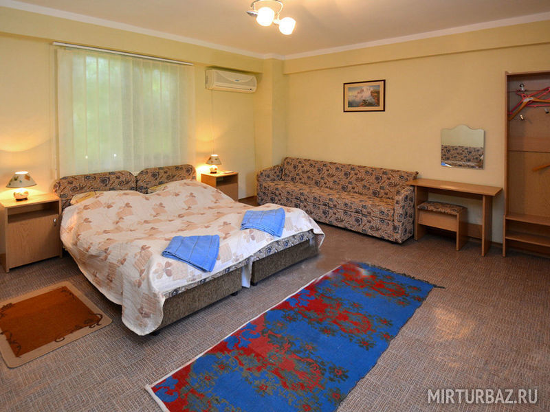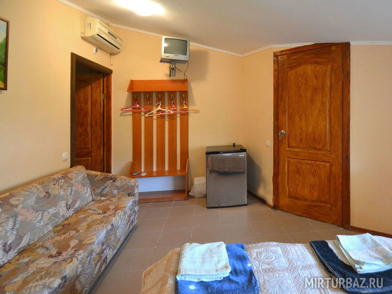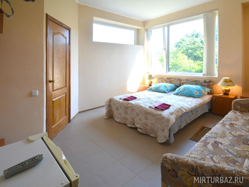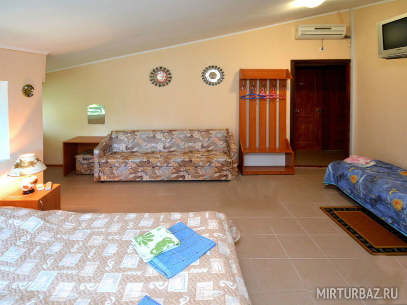 В номере 1 комната, двуспальная кровать, прикроватные тумбочки, два диван-кровати, вешалка для одежды, шкаф платяной, зеркало, санузел с душем. У номера есть маленький балкончик.