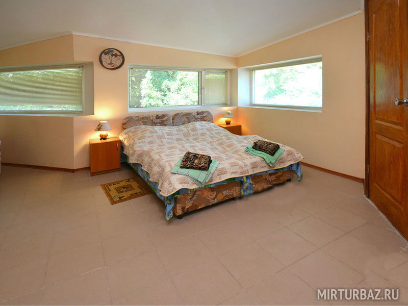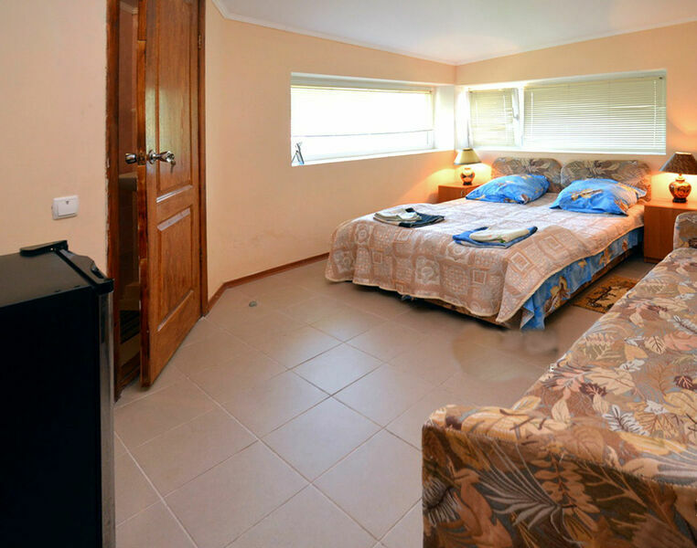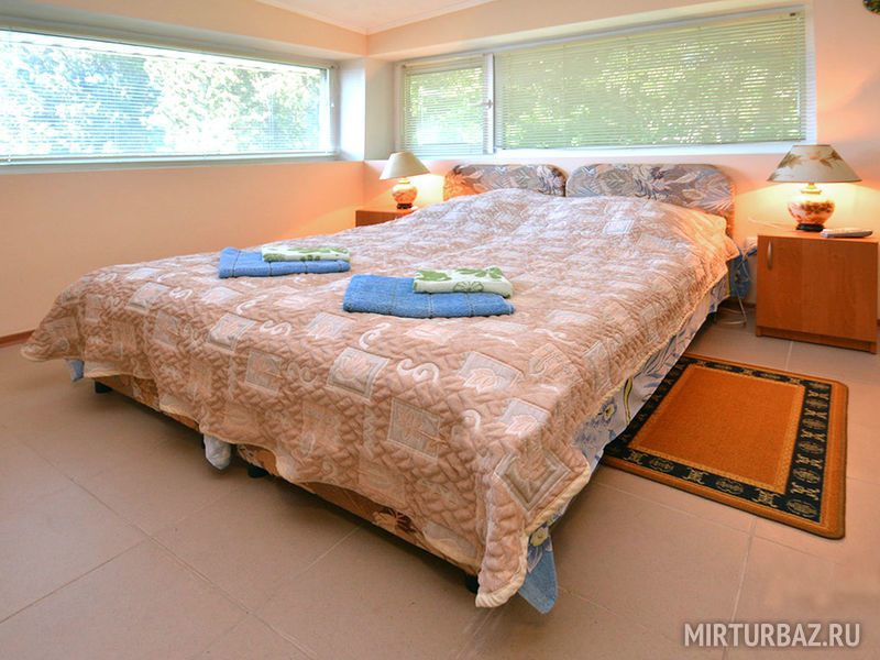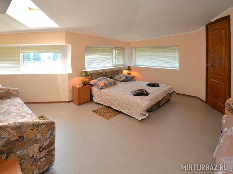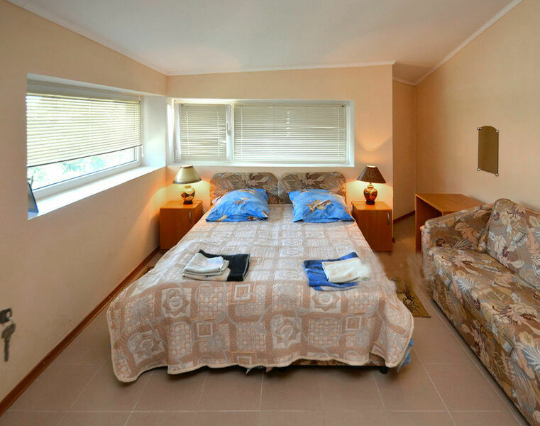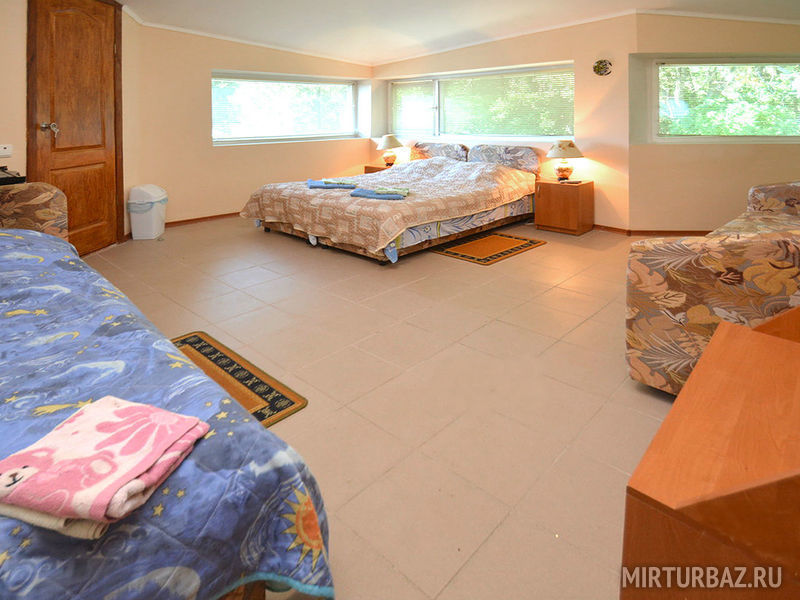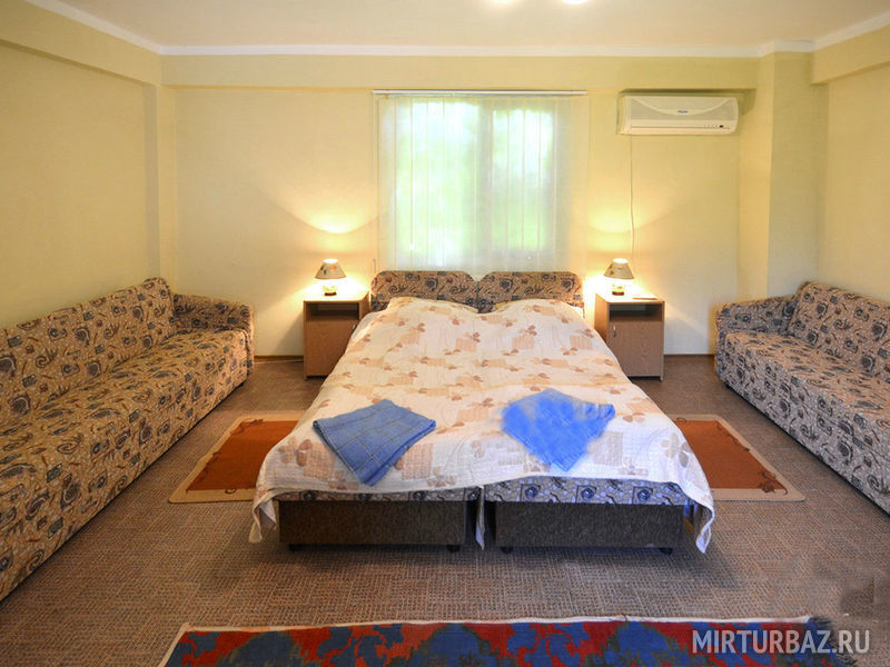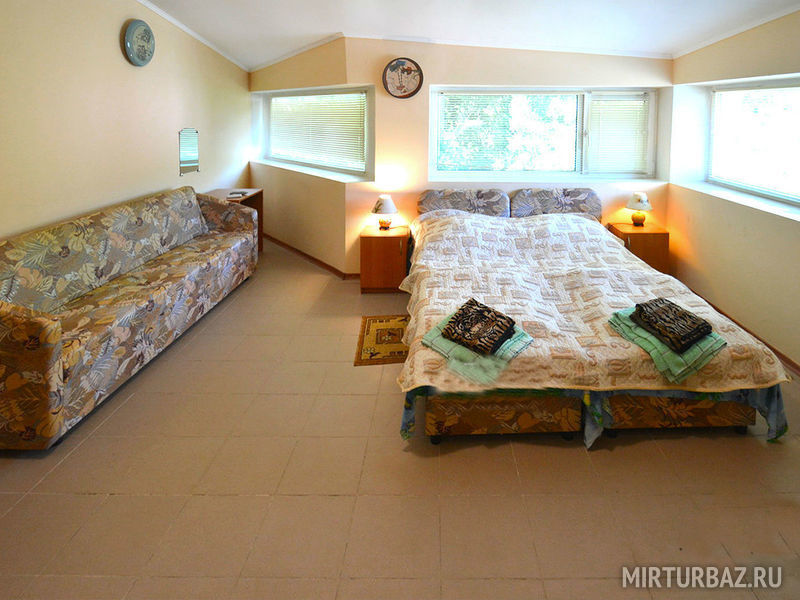 В номере 1 комната, двуспальная кровать, прикроватные тумбочки, два диван-кровати, вешалка для одежды, шкаф платяной, зеркало, санузел с душем. У номера есть маленький балкончик.