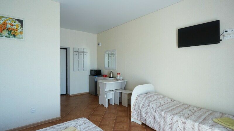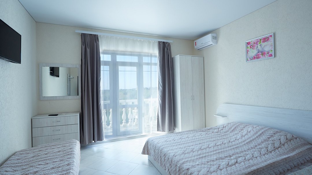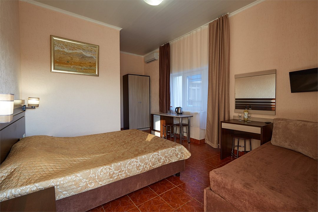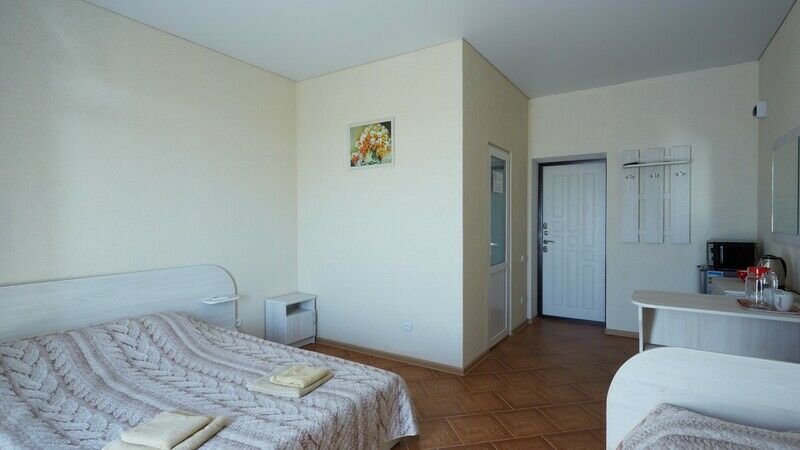 Улучшенные однокомнатные номера с видом на море оборудованы двуспальной кроватью и одной односпальной. Ремонт в номерах произведён в 2021 году, полностью обновлена мебель, в комплектацию добавлен фен, электрический чайник. Номер предназначен для проживания троих человек. Возможна установка дополнительного спального места или детской кроватки, по согласованию.Услуги и удобства