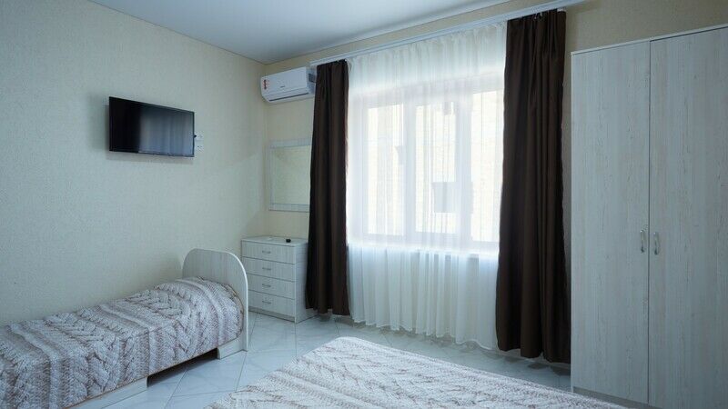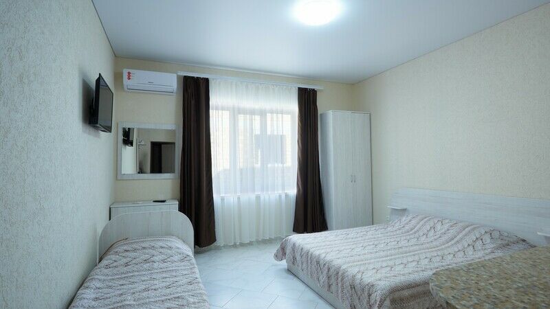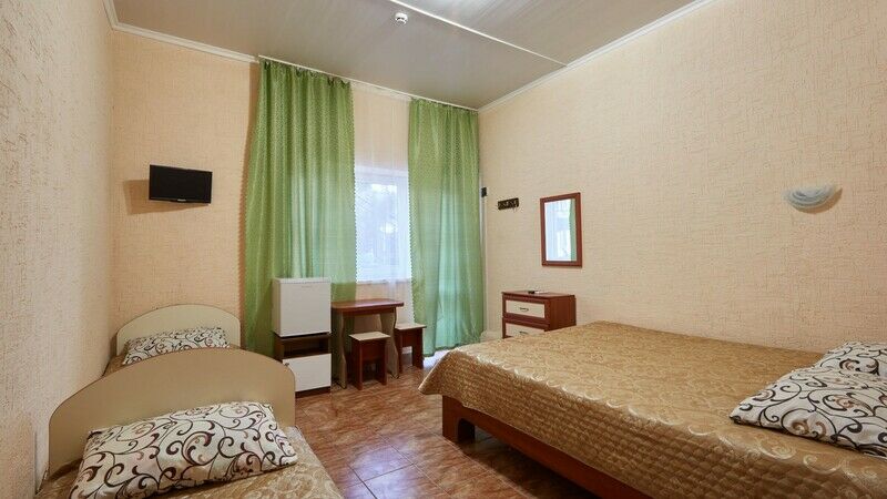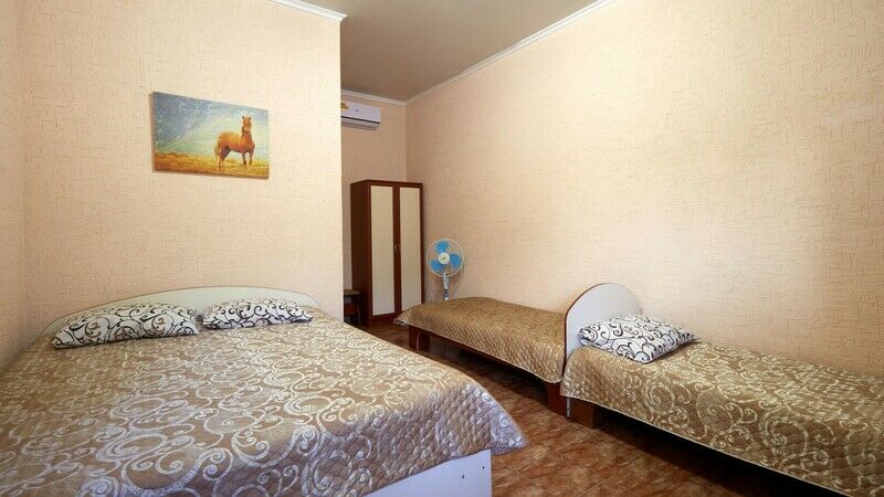 Двухкомнатный семейный номер с кондиционером идеально подходит для большой семьи или компании. Большая двуспальная кровать, двухъярусная кровать и односпальная кровать. Телевизор, холодильник, санузел с душевой кабиной, WI-FI, кондиционер. В проходной "родительской" комнате освещение организовано за счёт стеклянной входной двери, выходящей на южную балюстраду, в детской - окно во двор. То что нужно родителям, которые не спешат отойти ко сну после того, как уложат детей! Звездной крымской ночью можно прогуляться по пустынному пляжу или отдохнуть в нашем баре за бокалом вина. И можно не опасаться, по возвращении, потревожить сон юных спутников. Номер предназначен для проживания пятерых человек. Детская кроватка устанавливается по предварительному запросу, так же возможна установка дополнительного спального места.Услуги и удобства