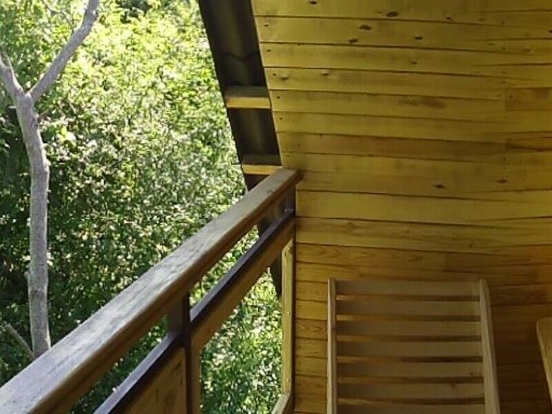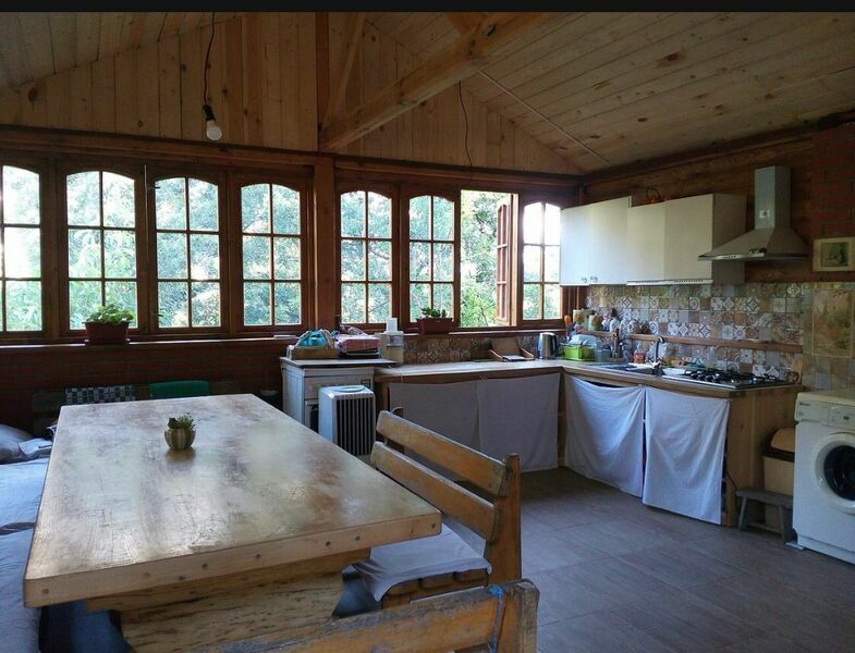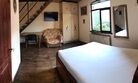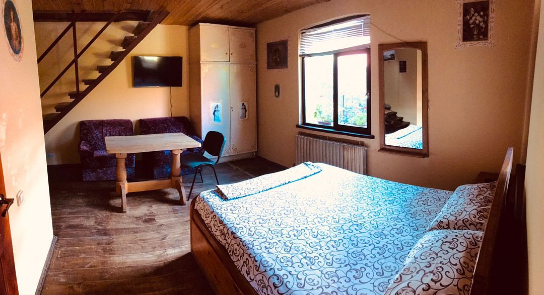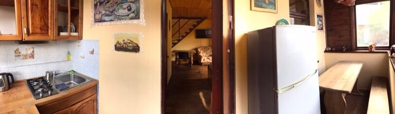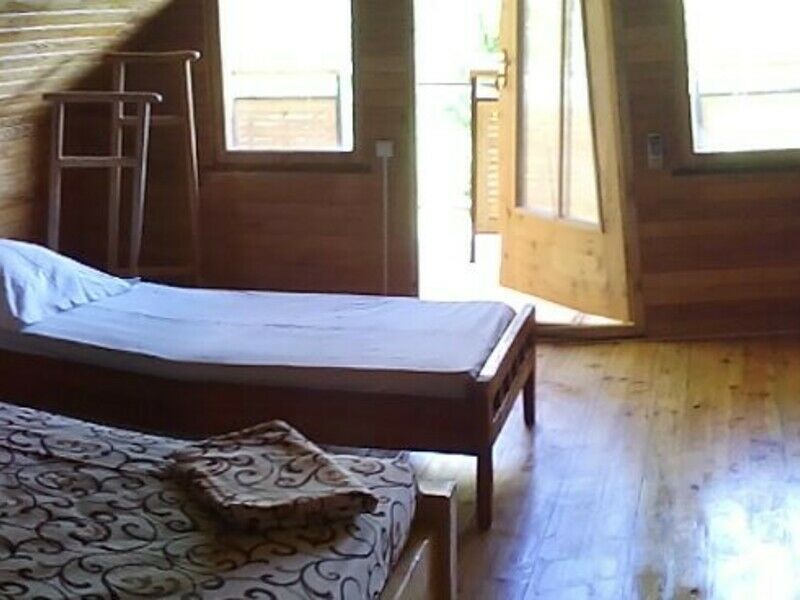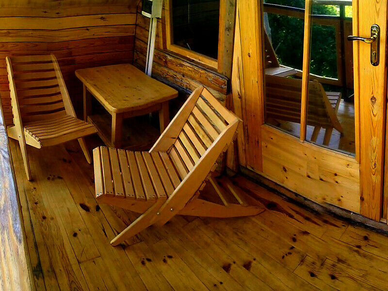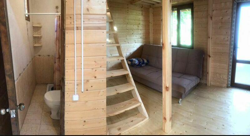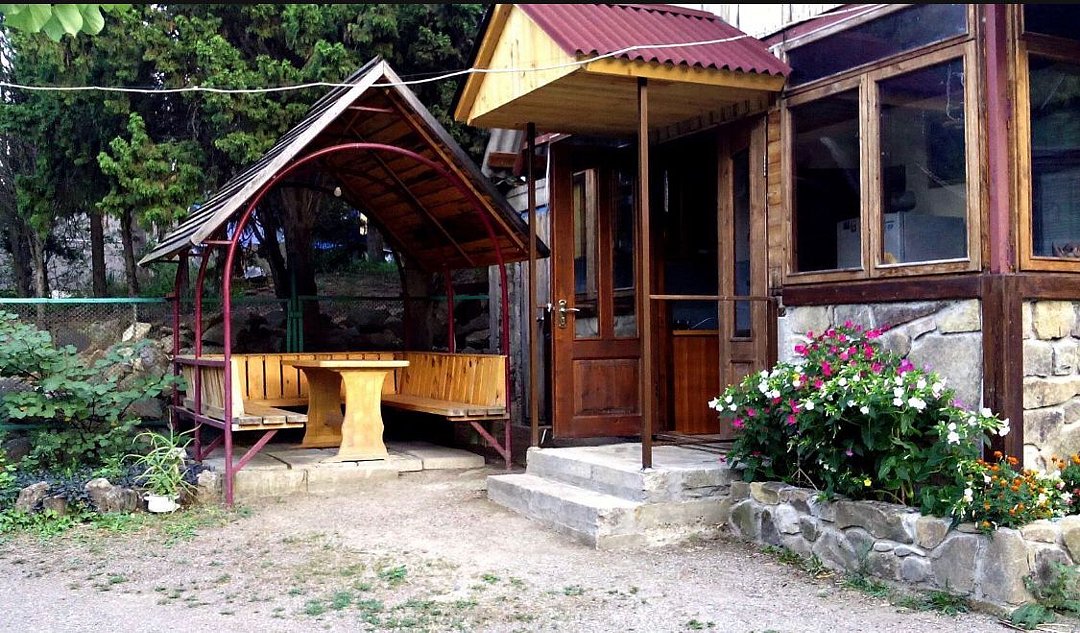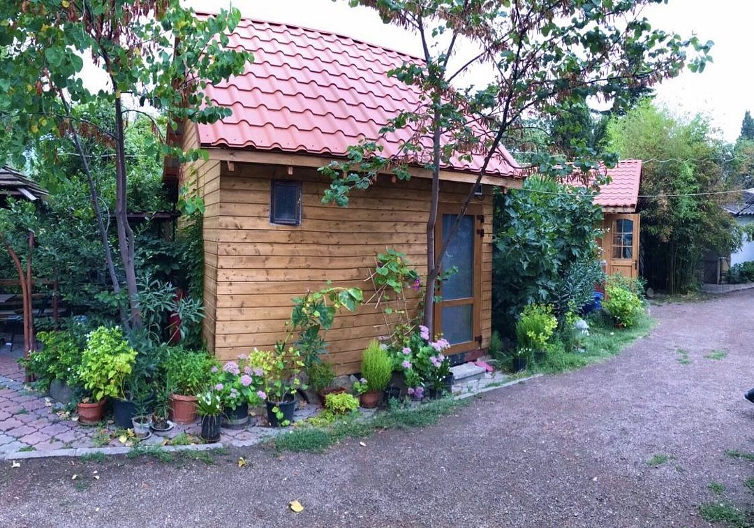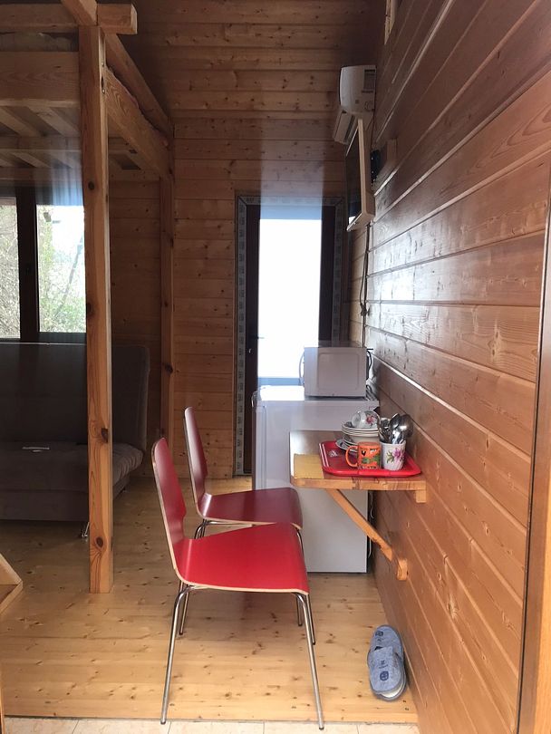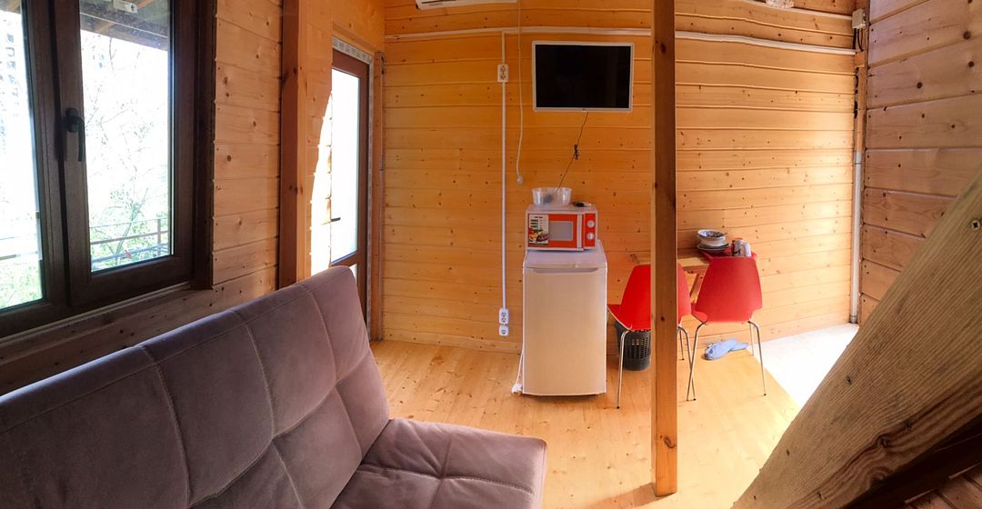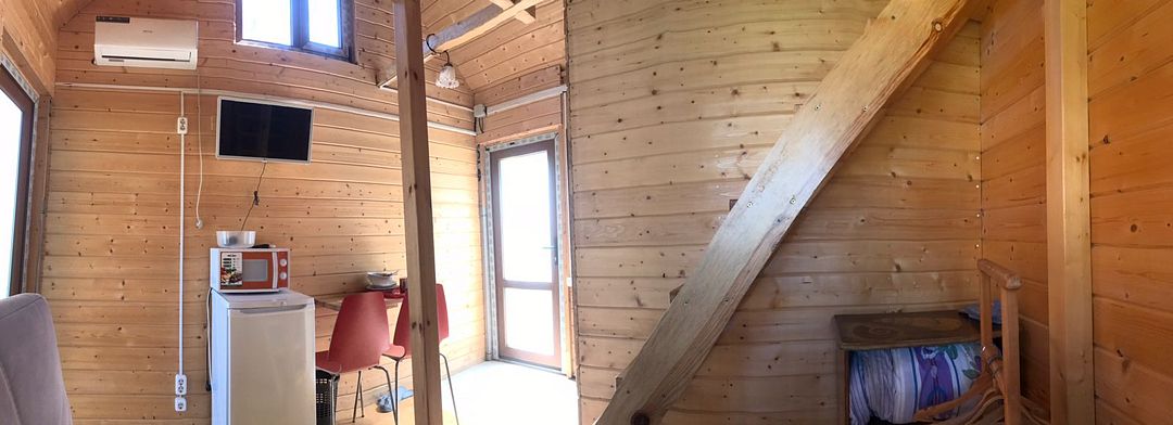 Имеет свой санузел, телевизор, холодильник, вентилятор, личная посуда для приёма пищи, постельное бельё. У этого коттеджа общая беседка, рассчитана на жителей этого коттеджа. В беседке/кухне имеется: плита для приготовления пищи, раковина, общий стол, чайник, микроволновая печь, посуда приготовления, утюг. Заезд в 11.30, выезд в 11.00.