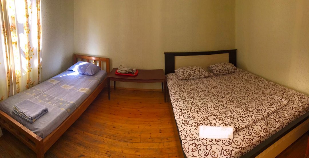 Комната № 2, семейная , жильё простое - бюджет, до 4-х человек. Находится в Деревянном коттедже на первом этаже, в коттедже 3 отдельных номера. У этого коттеджа общая беседка/кухня, рассчитана на ЖИТЕЛЕЙ ЭТОГО КОТТЕДЖА, в которой находится плита, раковина, общий стол, чайник, микроволновая печь, посуда для приготовления пищи, утюг.