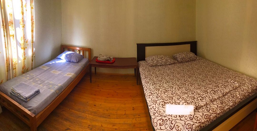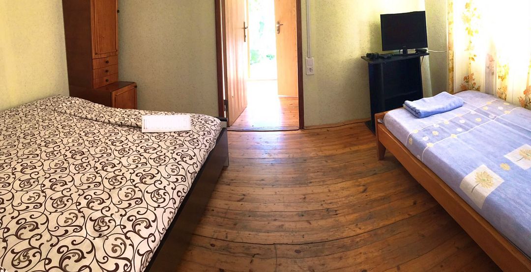 Комната № 2, на 1- 4 человека( максимум 2 взрослых 2 ребёнка(ДО 10-13 ЛЕТ)), балкон + стол и стулья, санузел, телевизор, кондиционер, холодильник, личная посуда для приёма пищи, постельное бельё. Эта комната просторная, удобная, имеет большой балкон/терраса- прохладный, на котором расположен столик и холд/к, на балконе можете уединённо отдохнуть в тени деревьев. Заезд в 11.30, выезд в 11.00.
