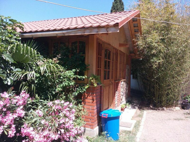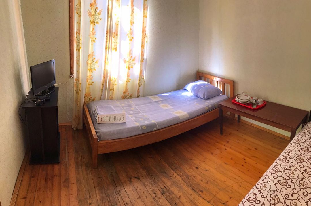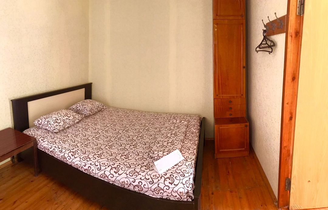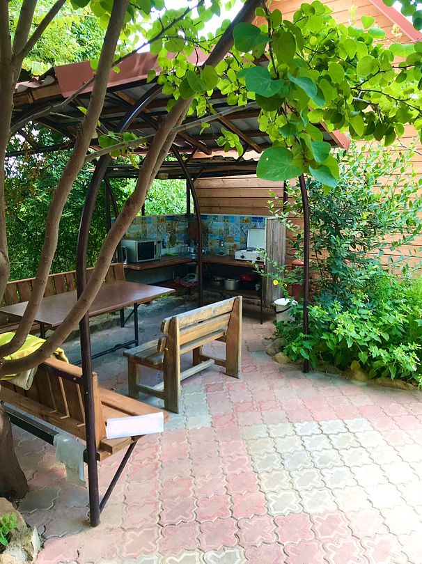 бюджетный вариант, на 4 чел. Двухкомнатное жильё (2 маленькие смежные комнаты), простое, свой санузел (бойлер), телевизор, холодильник, кондиционер, крыльцо, на крыльце стол/стулья. Кухня большая (летняя) рассчитана на две комнаты(№4 и №5) этого дома + хозяйка, расположена рядом с домом. Можно посидеть у себя на крыльце, покушать, отдохнуть под вековыми кипарисами.