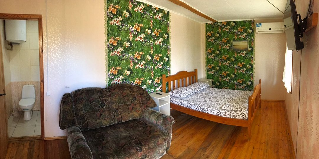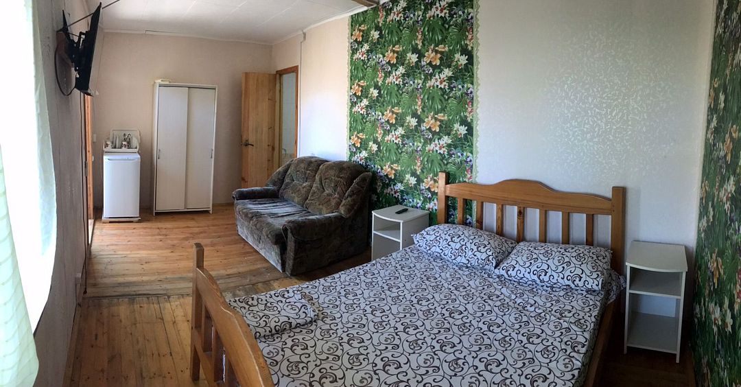 В комнате: балкон, санузел, телевизор, кондиционер,хол-к, личная посуда для приёма пищи. Широкая кровать 180 см., и односпалка стандарт. Кухня летняя рассчитана на три номера этого коттеджа : микроволновая печь, чайник, посуда для приготовления пищи, плита, утюг.