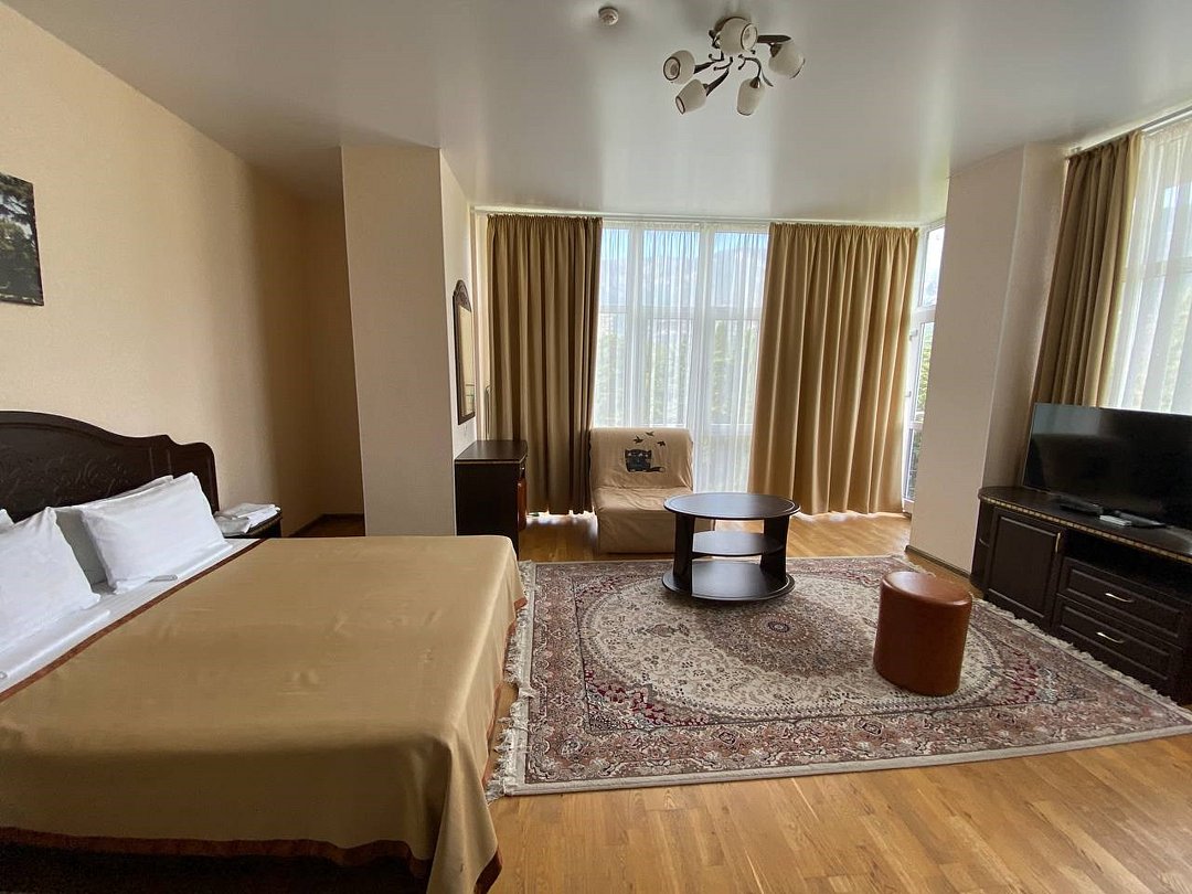 Люкс однокомнатный, с современным дизайном, с -2-х спальной кроватью и доп.местом диван-кровать, площадь 40 кв.м. Комната, коридор, сан. узел, номер с прекрасным видом на море. Кондиционер, телевизор, холодильник, электрический чайник, посуда. В санузлах - душевая кабина, умывальник. Номера расположены со 2 по 5 этаж. Корпус с лифтом. Проживание с животными категорически запрещено. В стоимость путевки входит: - 3-разовое питание по комплексному меню - комплекс медицинских процедур на основании Вашей санаторно-курортной карты - посещение бассейна/тренажерного зала - трансфер на набережную/пляж (в зависимости от сезона) - парковочное местоУслуги и удобства