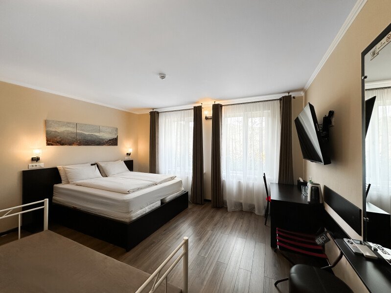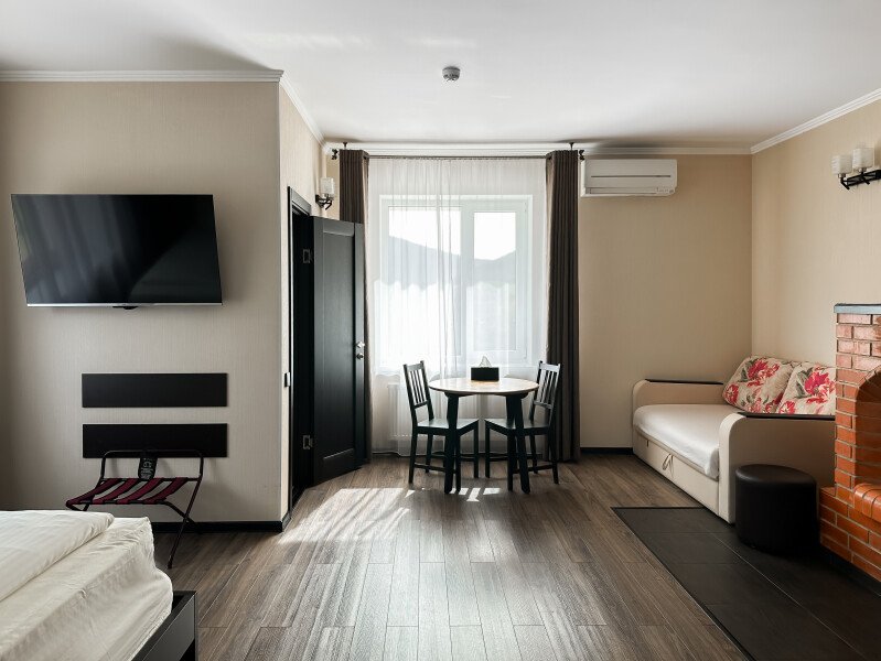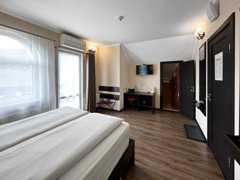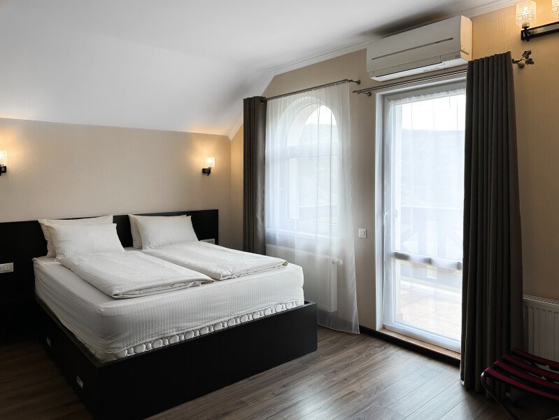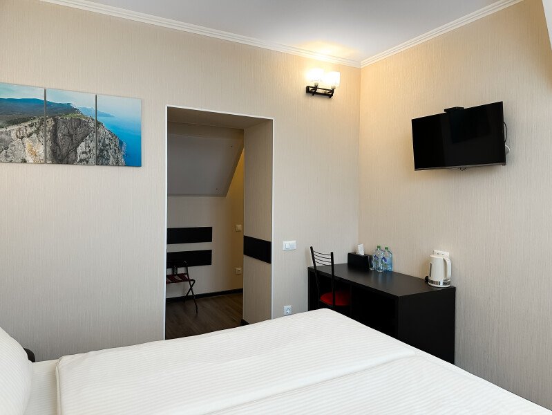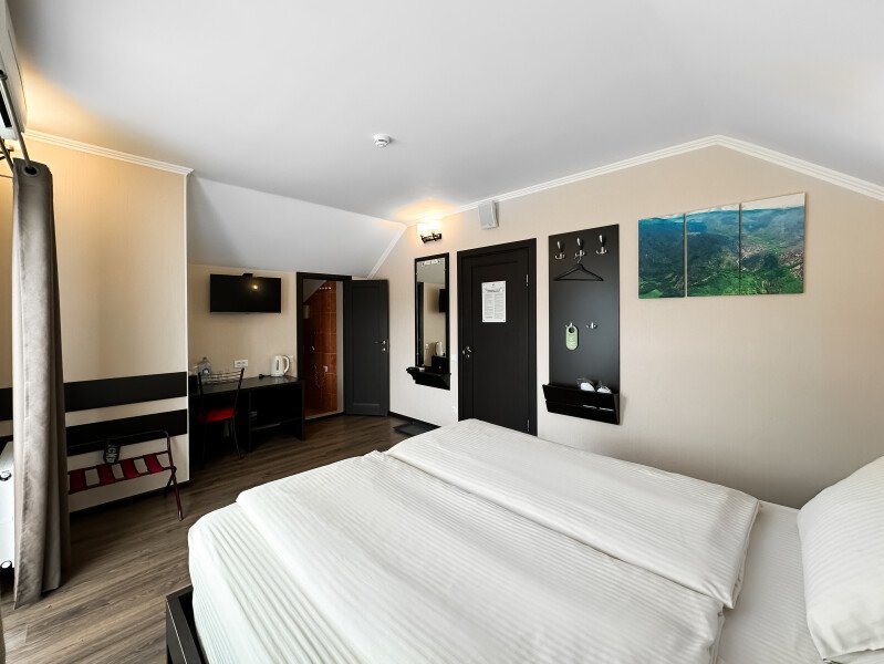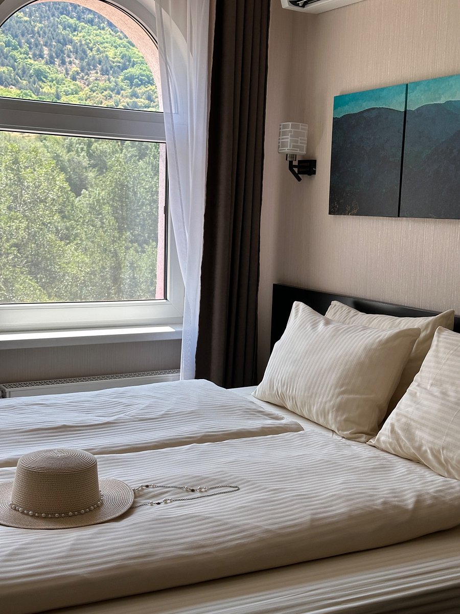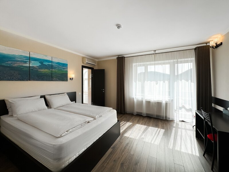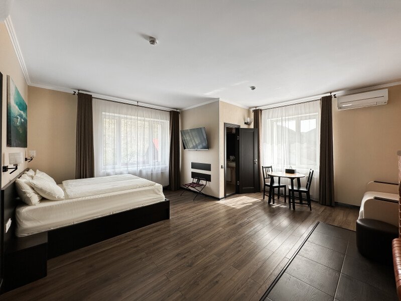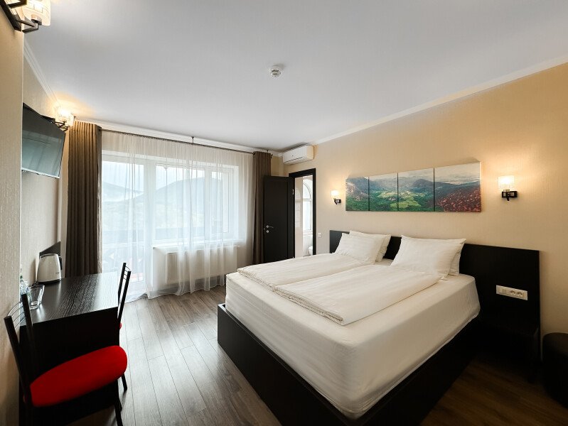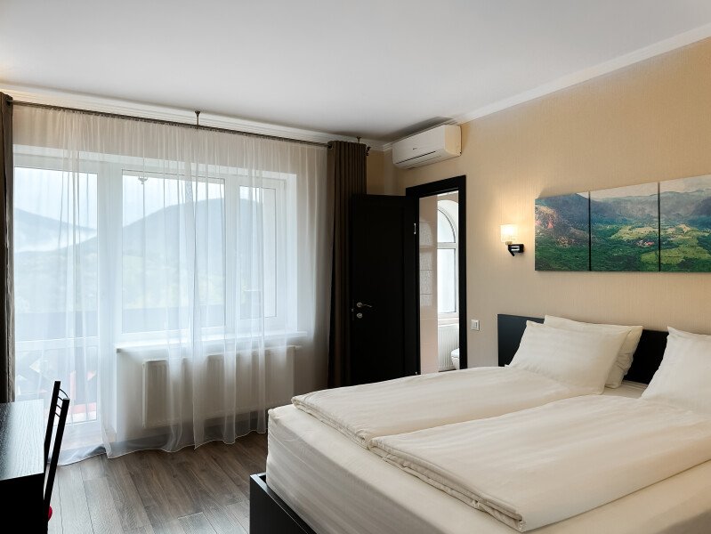 Каждый номер создан для достижения максимального комфорта отдыхающих и оснащён Wi-Fi, плазменным телевизором, удобной мебелью и прочими удобствами. Из окон открывается роскошный вид на горы.При необходимости возможно установить детскую кроватку.