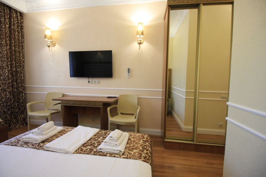 В каждом номере есть двуспальная кровать, плазменный телевизор, кондиционер, холодильник, стол, тумбочки, кресла. Санузел с душем, феном, туалетными принадлежностями. Гостям предоставляются халаты, постельное бельё и тапочки. Часть номеров с балконами.