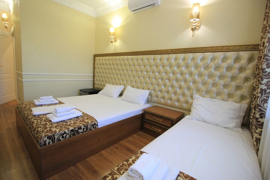 Две односпальные кровати, одна двуспальная кроватьВ гостиничном номере
