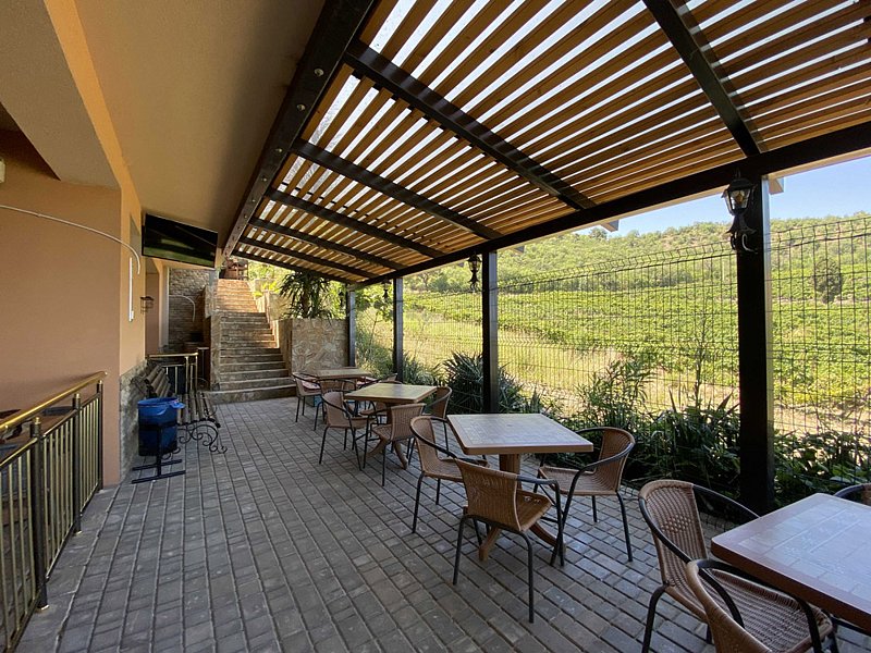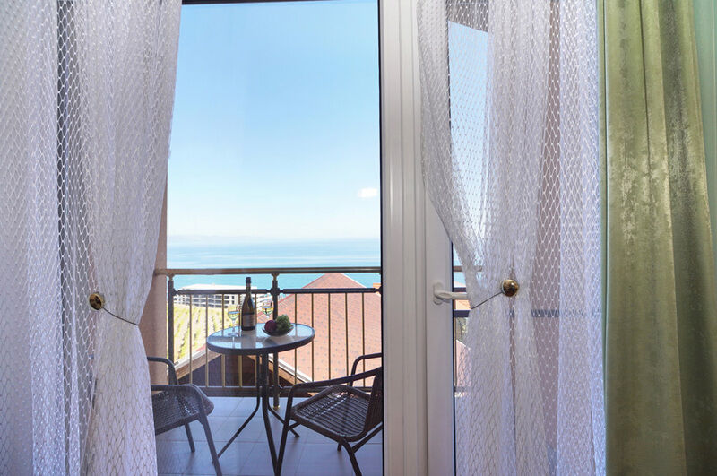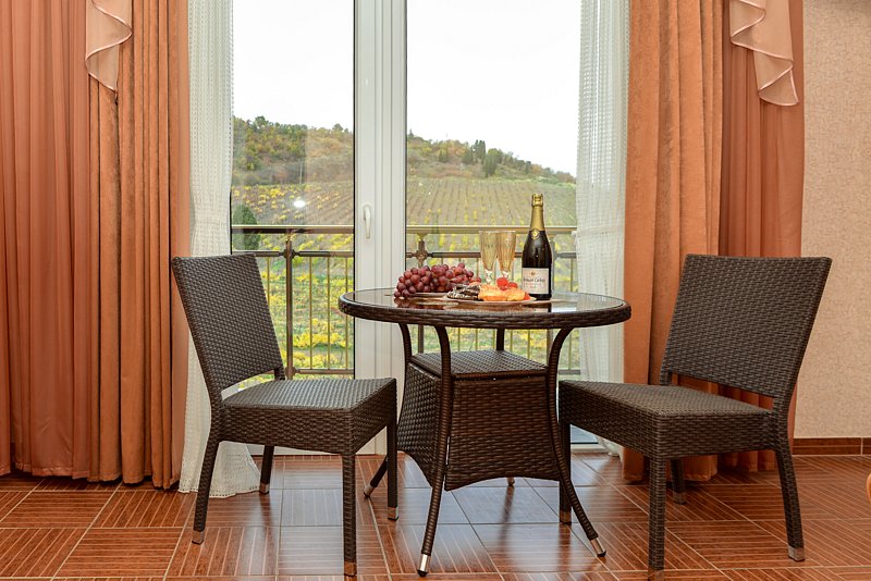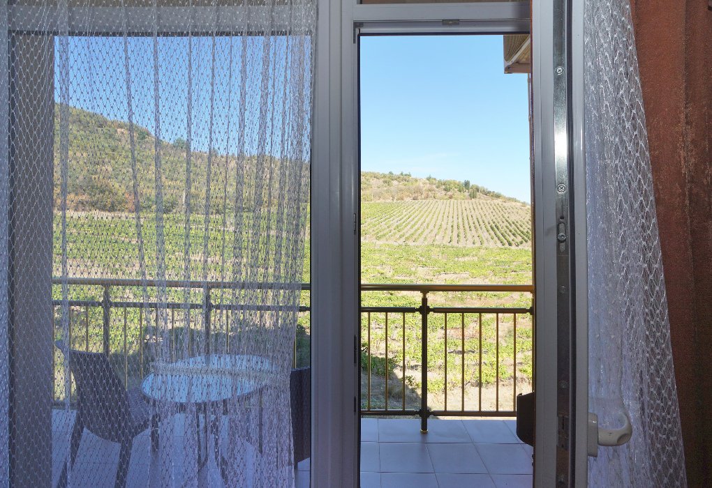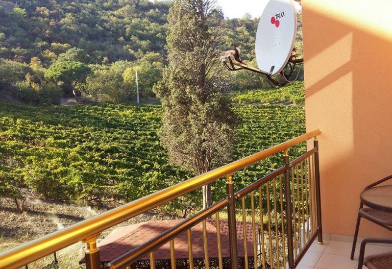 С балкона открывается потрясающий вид на виноградники, море и горы.