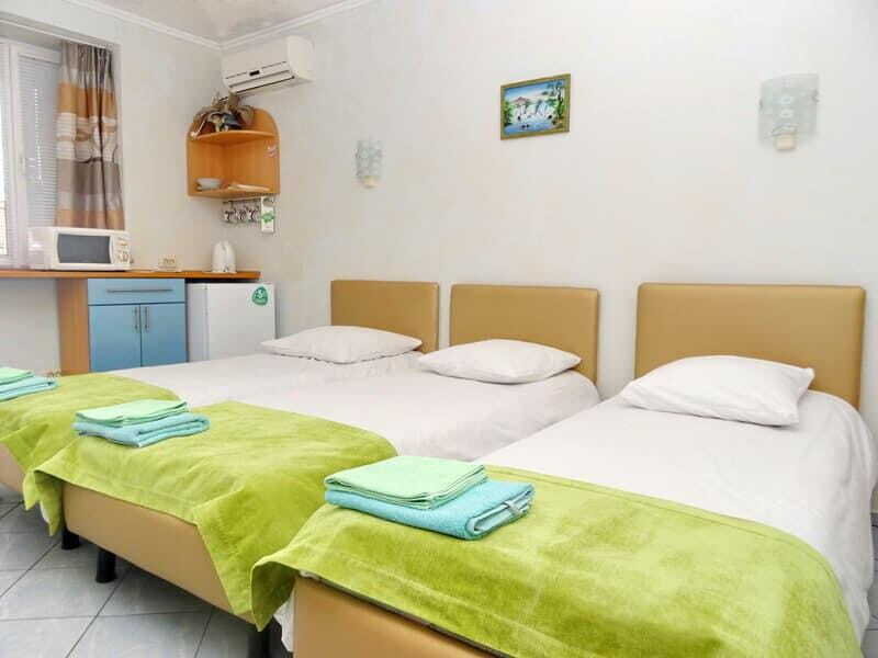 В комнате три односпальные кровати с ортопедическими матрасами, шириной 80 см.