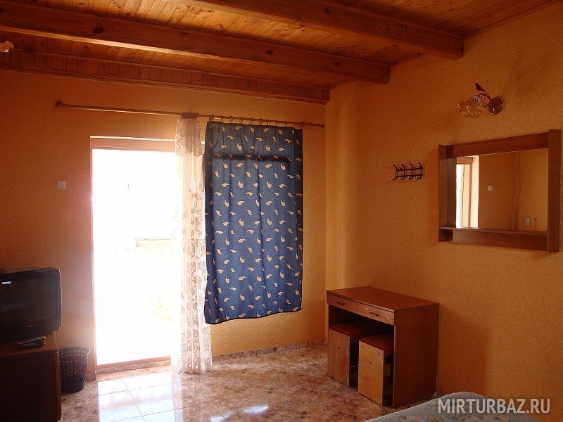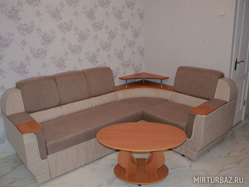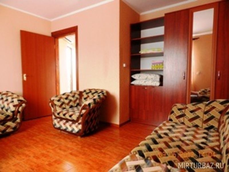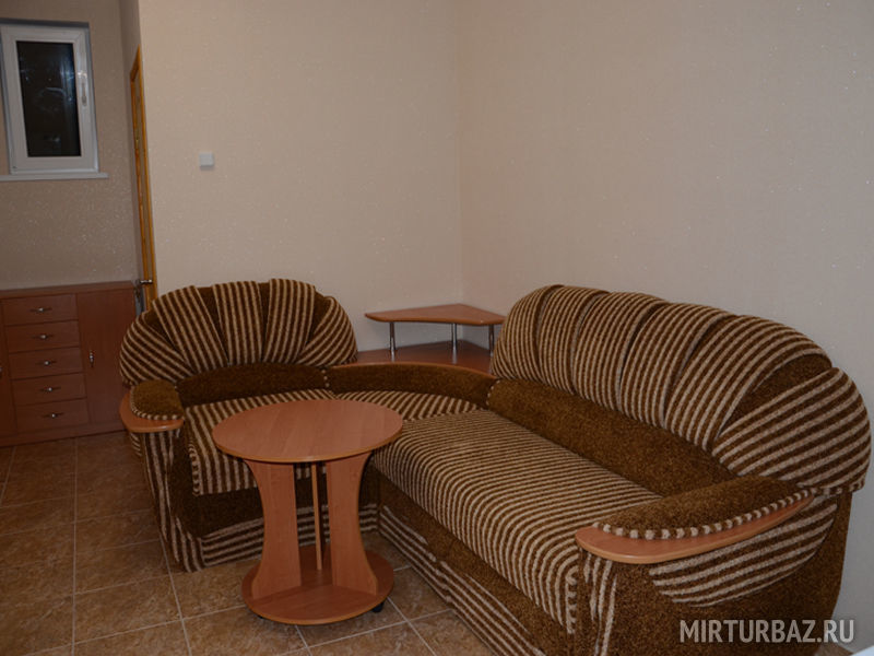 Двухкомнатные комфортабельные номера, 4-х, 5-ти местные, с видом на море. Комнаты раздельные. В номере: двуспальная кровать, тумбочки, мягкая мебель, шкаф для вещей и сумок, телевизор, холодильник, кондиционер, санузел, горячая, холодная вода, фен.