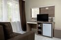 В гостевой зоне размещены мягкий угловой диван, столик, телевизор. Гости могут воспользоваться необходимой посудой и электрическим чайником. Имеется возможность заказать в баре ароматный или травяной чай.