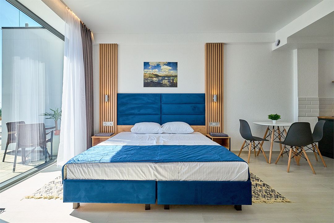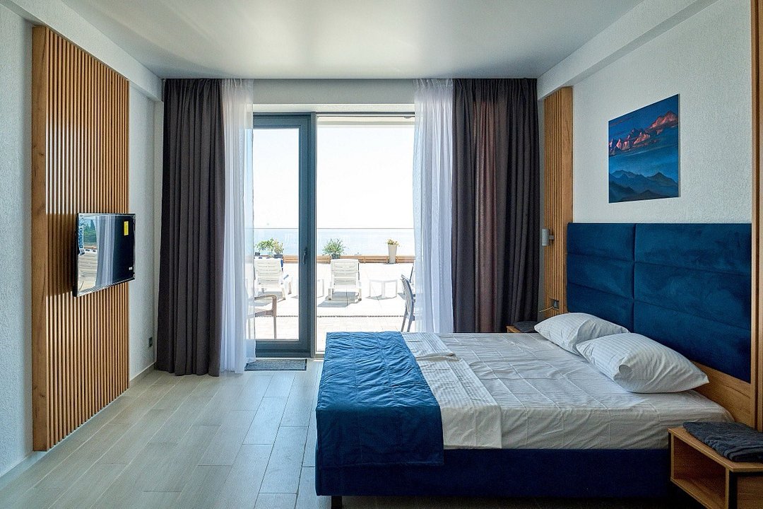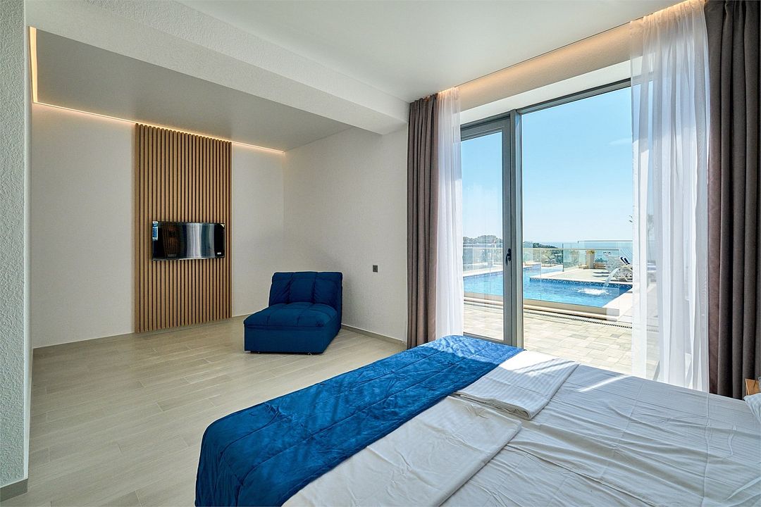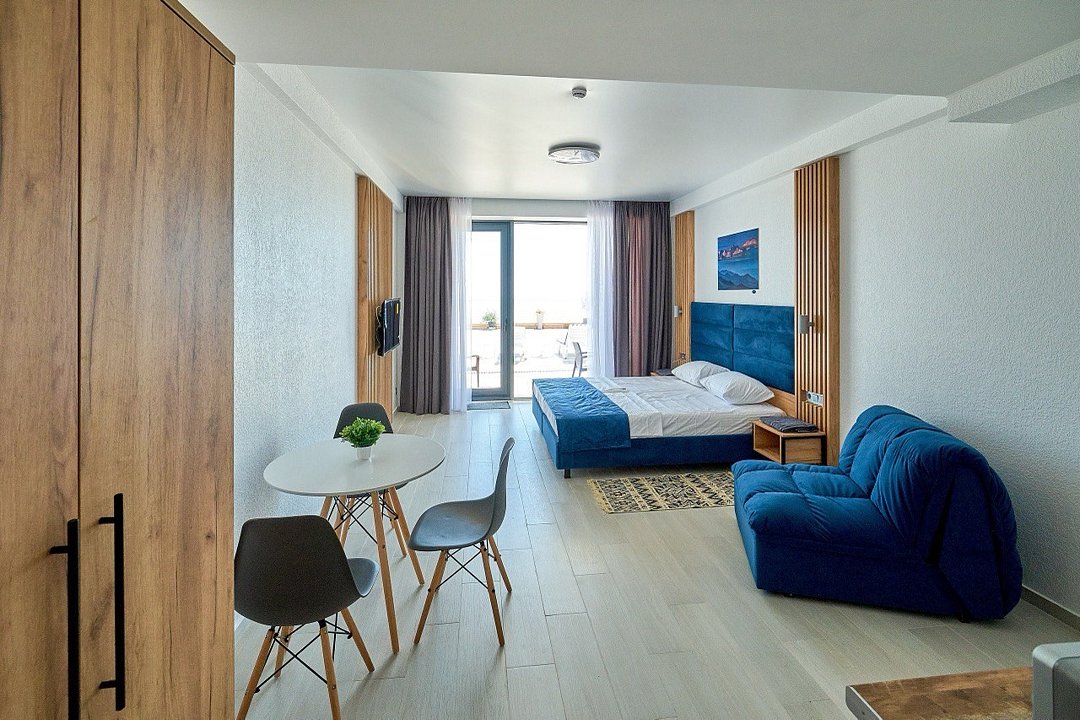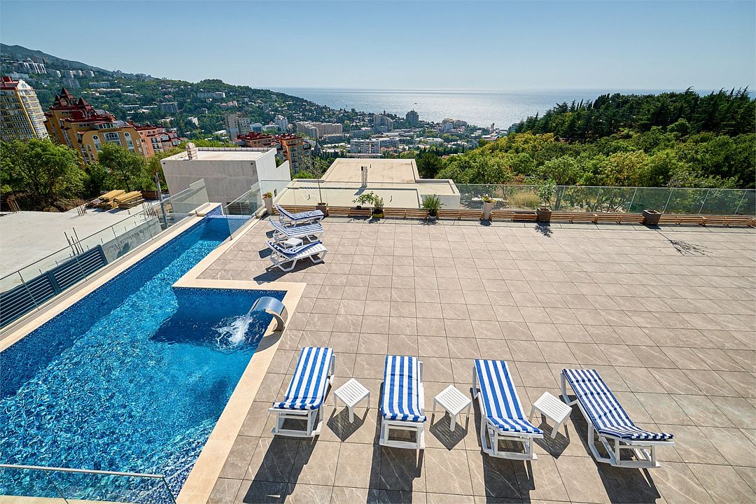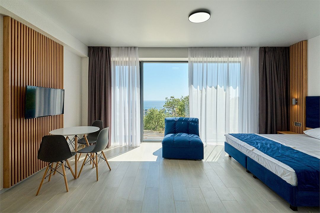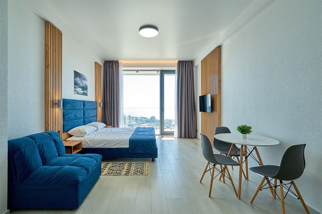 Парящая над морем стильная студия с закрытой территорией, с панорамным остеклением и балконом, выходящим на море и город. Из номера имеется прямой выход к бассейну. Номер рассчитан на 4-х гостей.Услуги и удобства