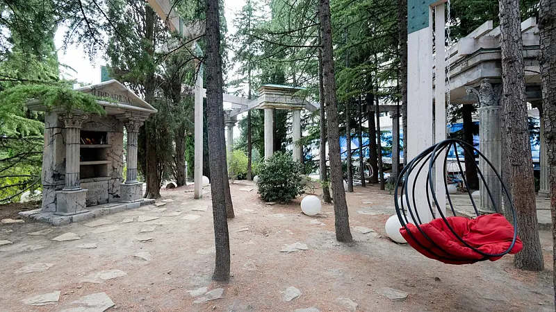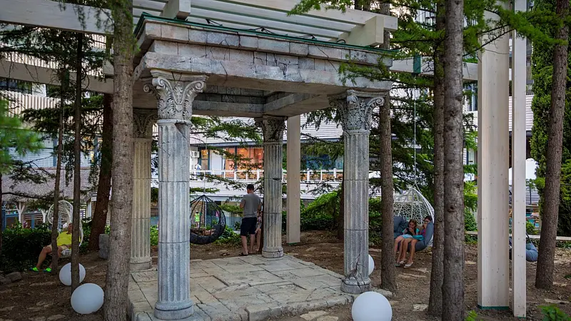 Парк коконов – это новая зона релакса, расположенная возле переливного бассейна с джакузи «Инфинити». Здесь можно в тишине, уюте и тенистой зелени южных деревьев подышать целебным крымским воздухом, удобно устроившись в мягких креслах-коконах. Они размеренно покачиваются в окружении тематических античных колонн, которые переносят всех гостей в мир греко-римских легенд и сказаний.