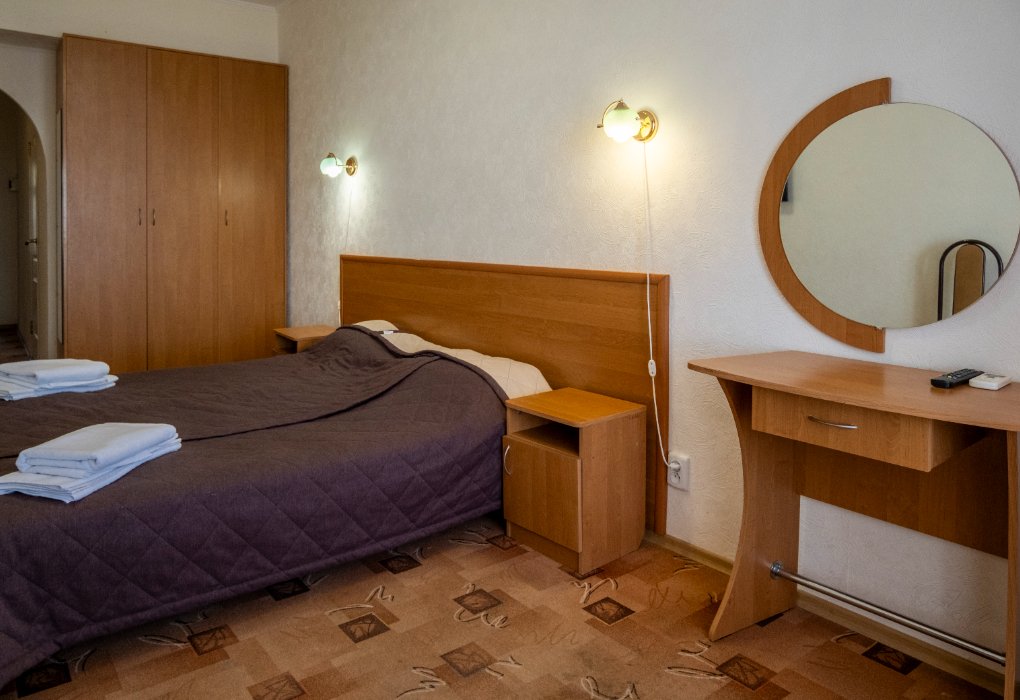 Семиэтажный корпус рассчитан на 306 мест. Построена здравница со 168 номерами эконом-класса в 1997 году, а после реновации в 2015-м в ней появились более комфортабельные номера: к «стандарту» добавился «улучшенный». В одно- и двухместных номерах с видом на Ай-Петри или море есть холодильники, телевизоры и санитарные удобства, однако горячая вода подается по графику.