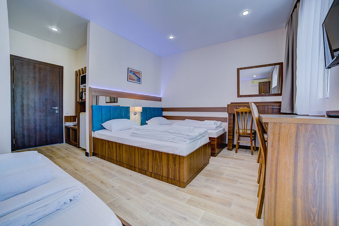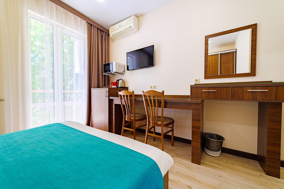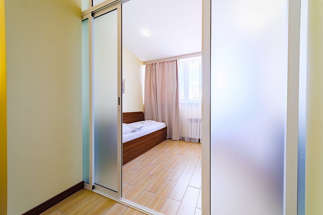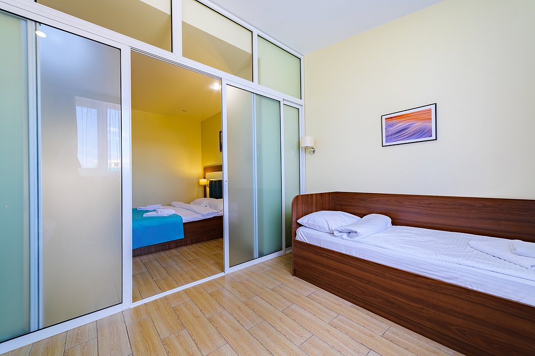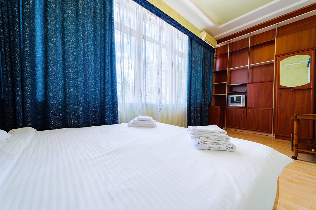 К вашим услугам: двуспальная кровать, односпальная кровать с ортопедическими матрасами, кондиционер, телевизор, холодильник, микроволновая печь, чайник, набор посуды, сейф, тапочки. С/у с душевой кабинкой, фен, гигиенические наборы, мыло, гель, шампунь.