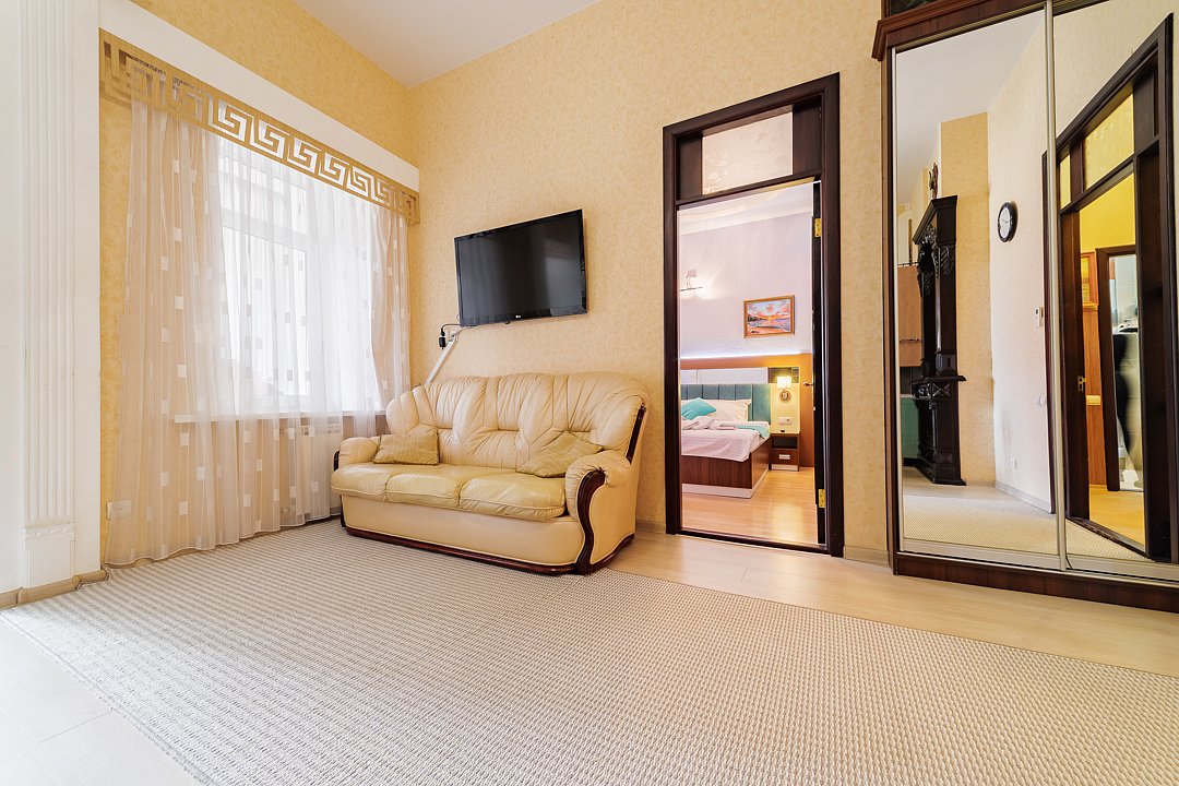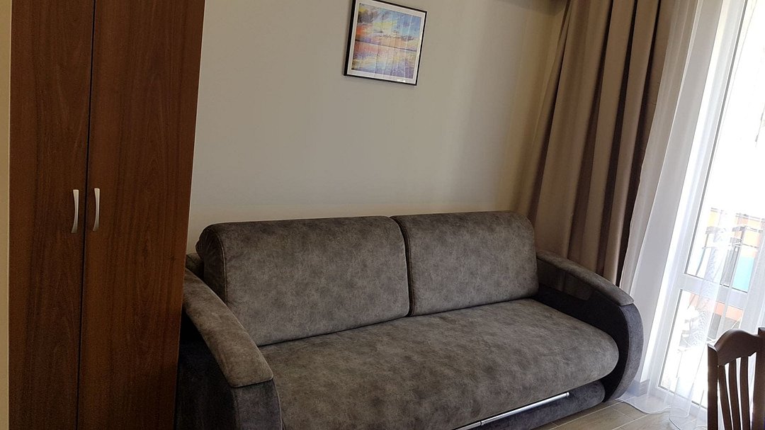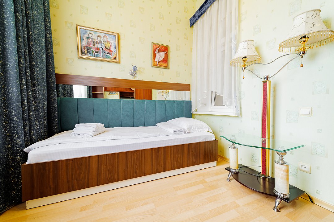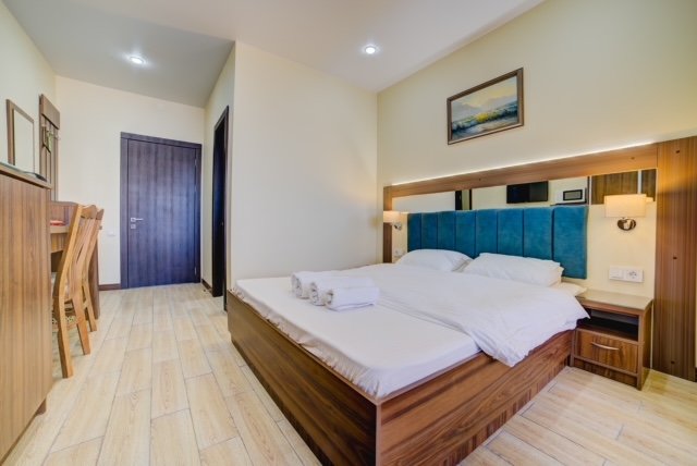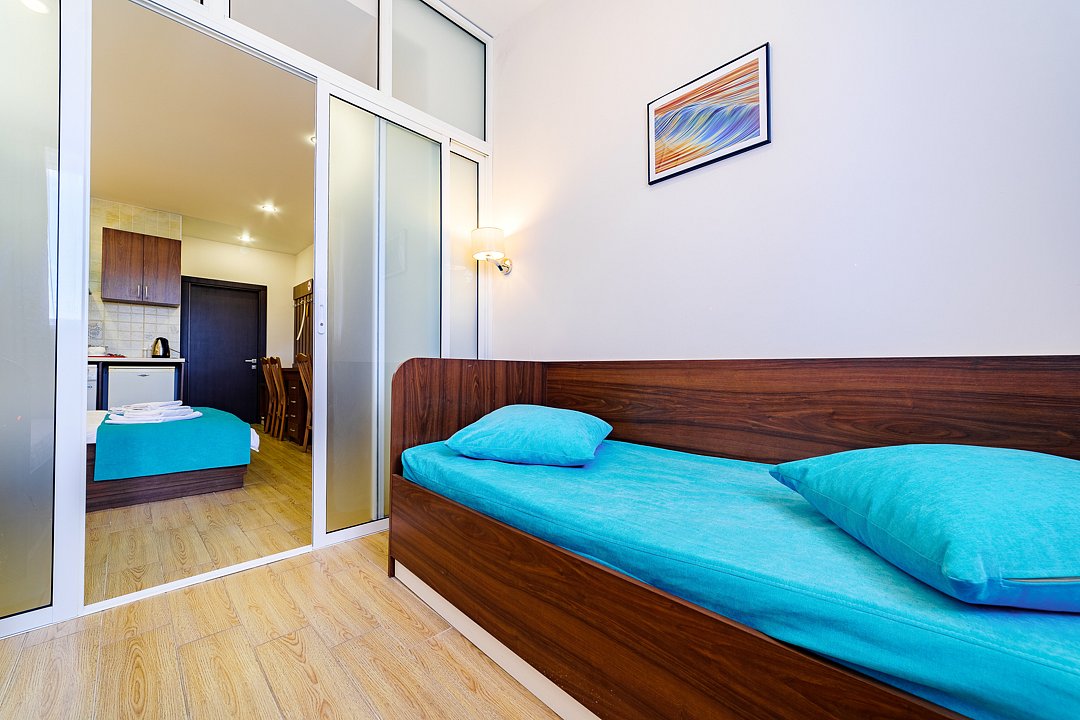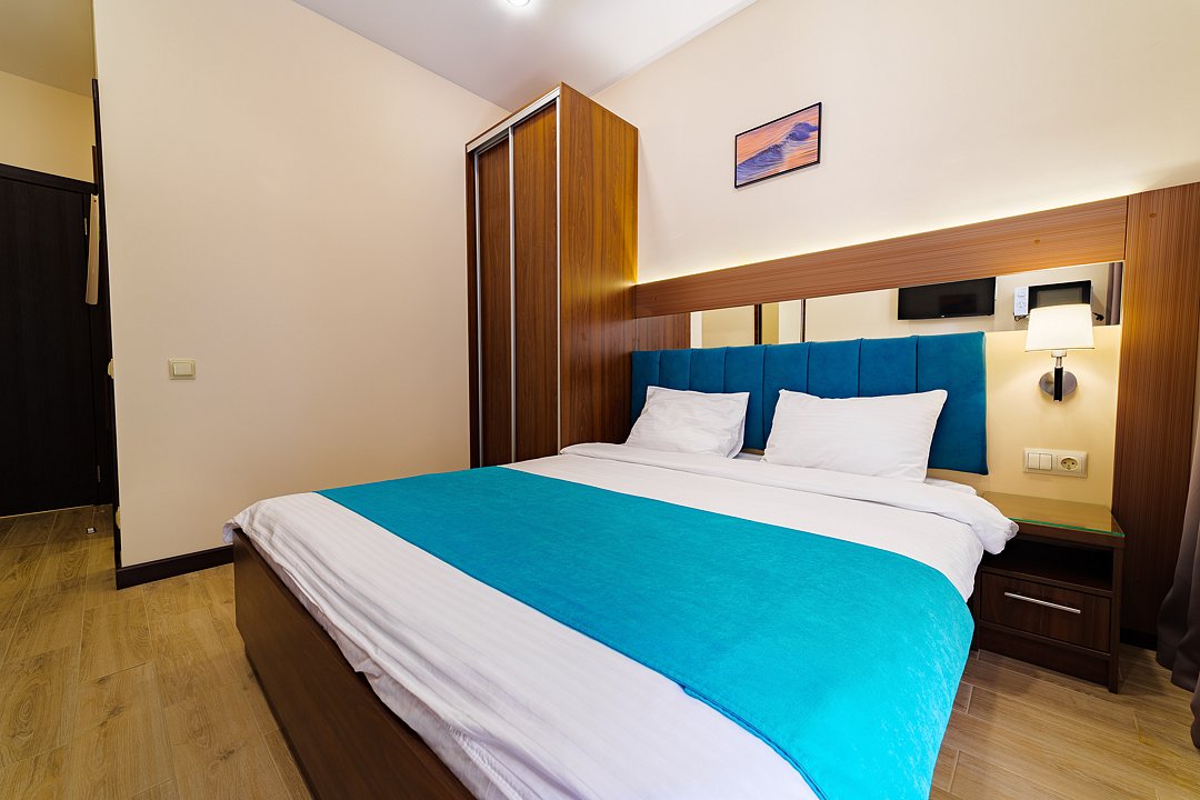 К вашим услугам: двуспальная кровать, односпальная кровать с ортопедическими матрасами, кондиционер, телевизор, холодильник, микроволновая печь, чайник, набор посуды, сейф, тапочки. С/у с душевой кабинкой, фен, гигиенические наборы, мыло, гель, шампунь.