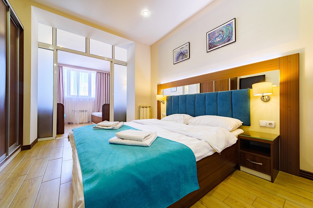 К вашим услугам: двуспальная кровать, две односпальных кровати с ортопедическими матрасами, оборудованная кухня с посудой и электрической плитой, стиральная машина, холодильник, чайник, микроволновая печь, кондиционер, сейф, телевизор, тапочки. С/у с душевой кабинкой, фен, гигиенические наборы, мыло, гель, шампунь. Предусмотрена перегородка для деления комнаты на две части.