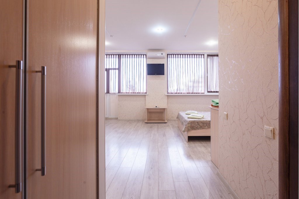 С балкона номера категории «Люкс-студио» открывается великолепный вид на парк и море или бассейн и море. В номере может разместиться до 5 человек. Номер состоит из 1 просторной комнаты с мини-кухней. Предусмотрен индивидуальный санузел с ванной, круглосуточная подача горячей и холодной воды (установлен бойлер), кондиционер, холодильник, телевизор, сейф, фен.Услуги и удобства